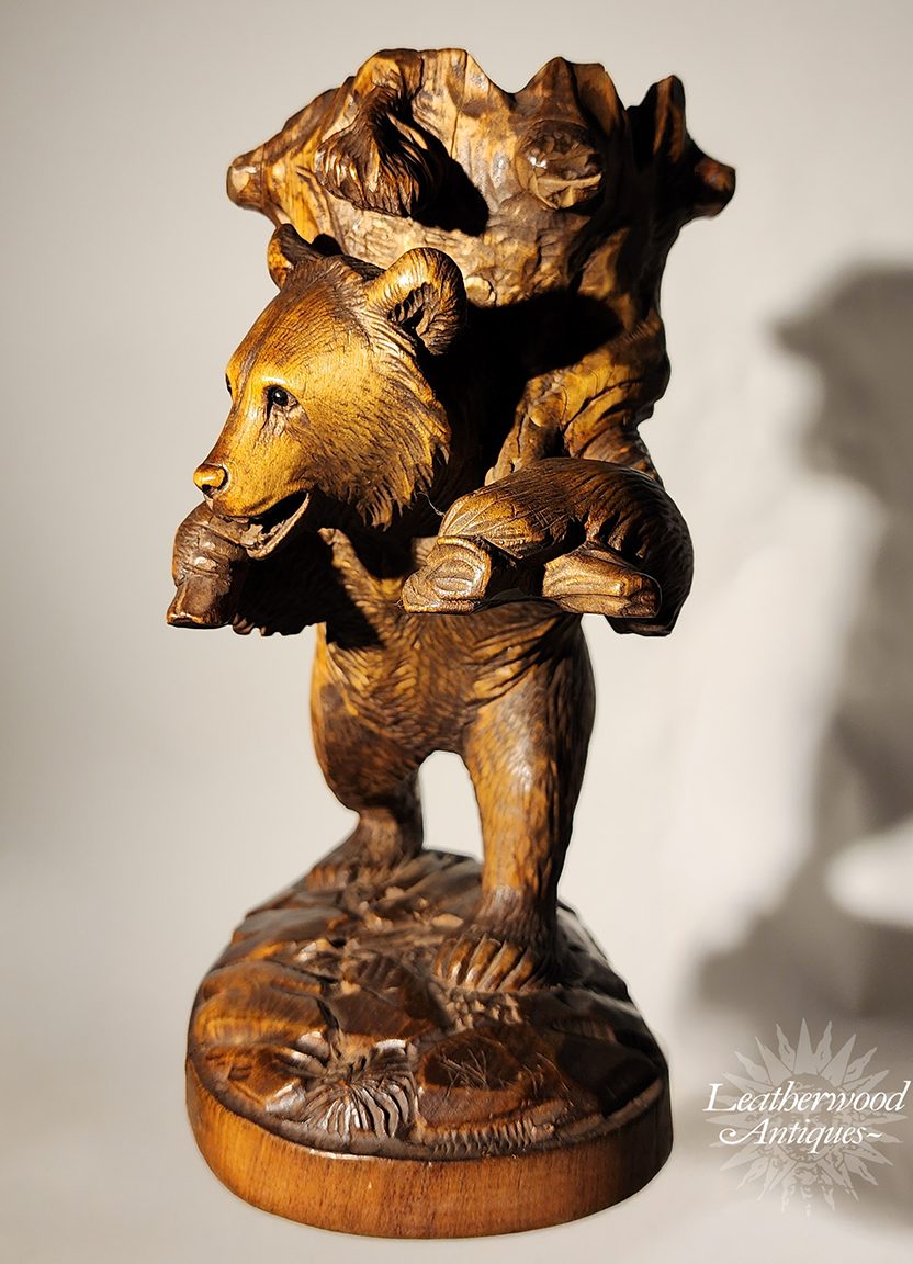Momma bear with a good bear face. The head lifts-up to reveal a cavity for tobacco with a carved table top with three bear cubs. Nicely carved. Swiss c. 1890.