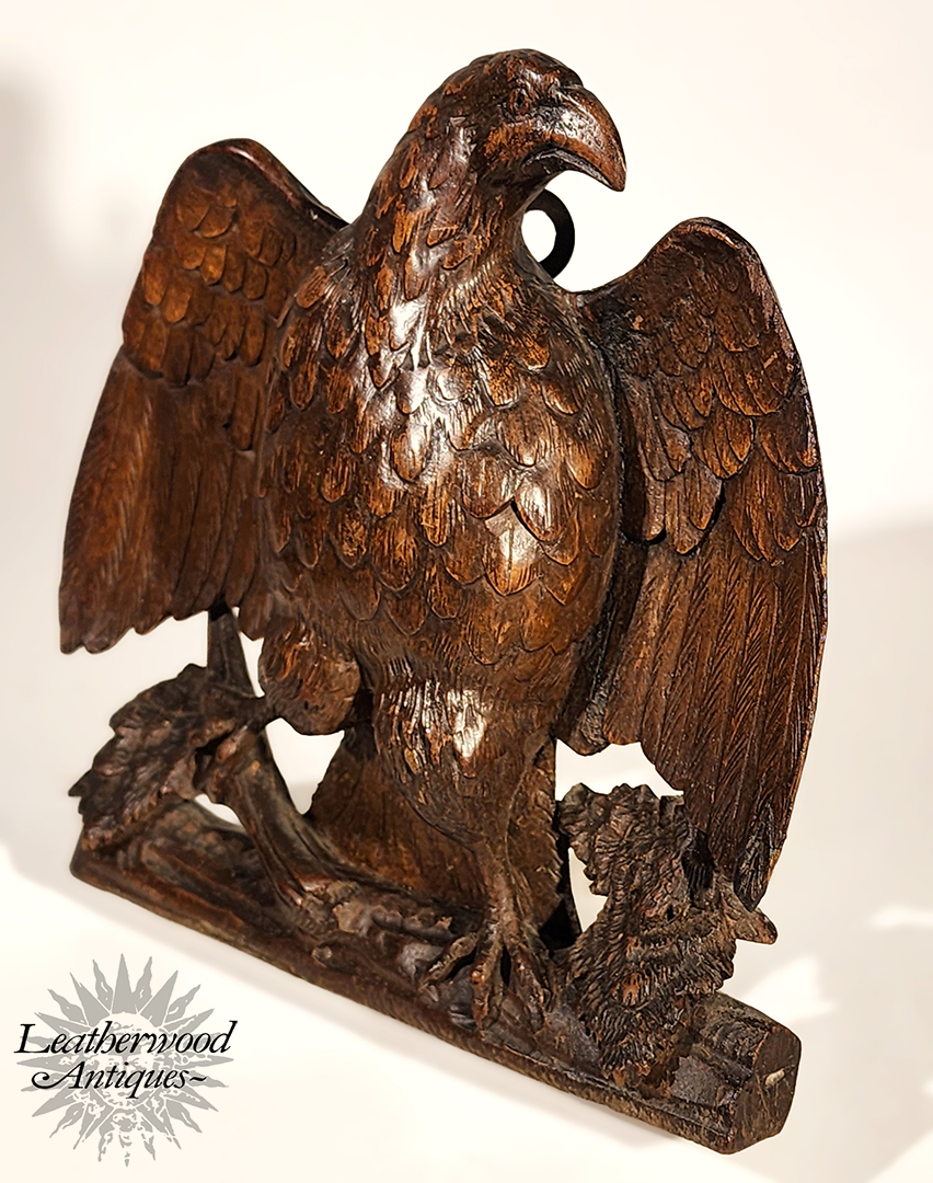 A finely carved small eagle with rich feather detail and a strong, alert presence. Flat‑backed for versatile display—hang it on a wall or stand it on a desk. Swiss, Late 19th Century.