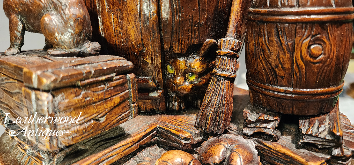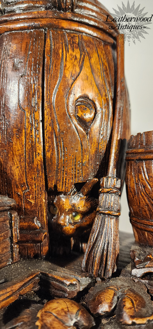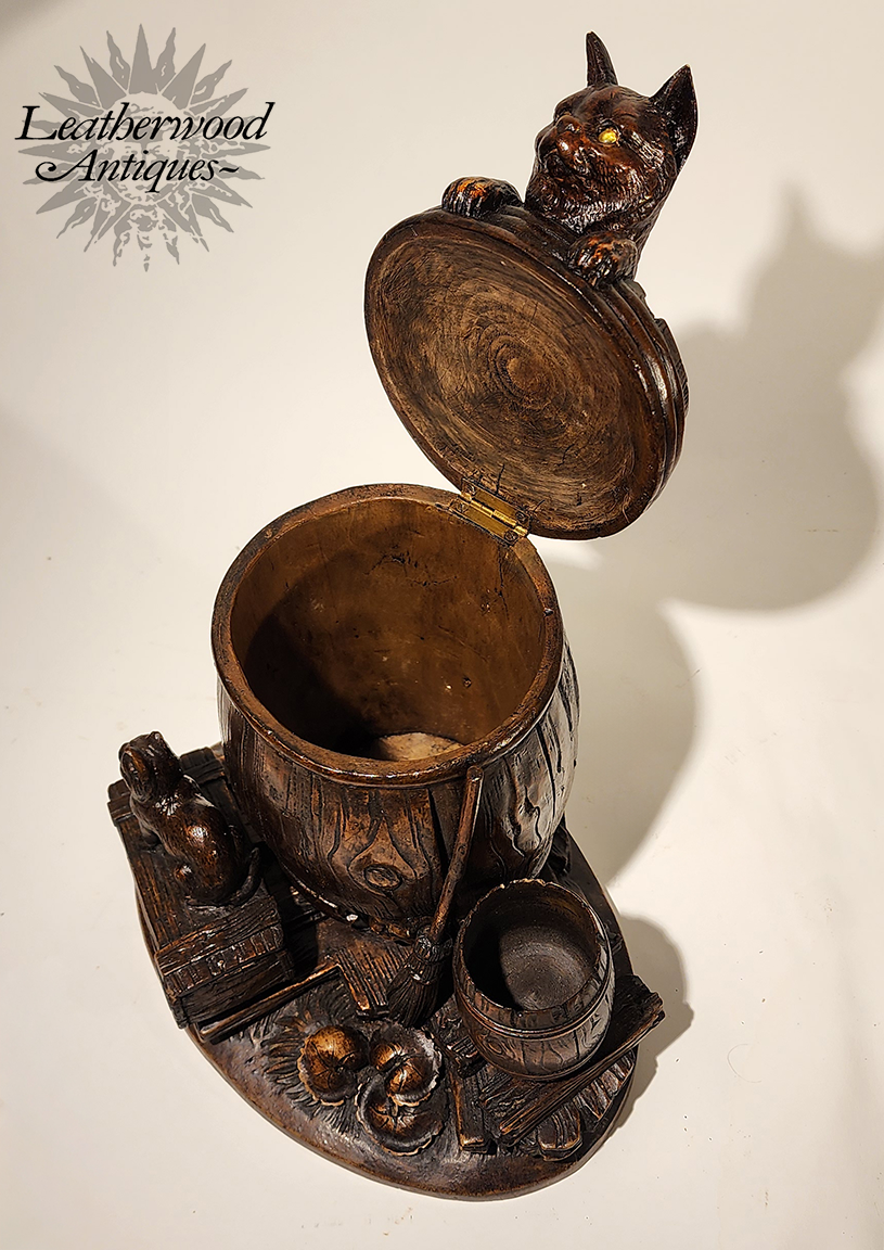 Black Forest Tobacco Box in the shape of barrel with a cat coming out of a hole within the barrel’s base. The barrel opens from the top with a hinge. Swiss c. 1880.