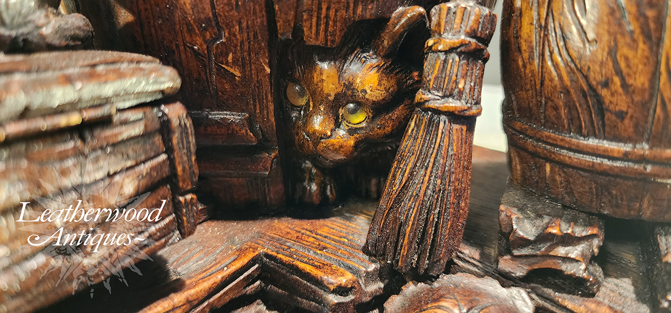 Finely carved special walnut tobacco box featuring a cat peering over the top and another peeking from the underside (not visible in this photo). A broom rests beside the box, and a smaller cat sits on the lid—a hinged match safe. Swiss, Late 19th Century.