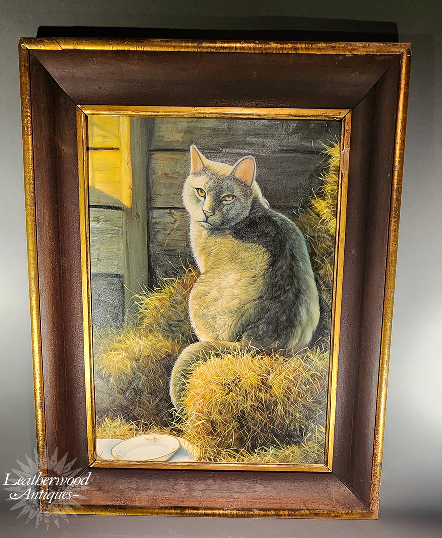 This stunning oversized oil painting brings a touch of rural serenity home. A beautiful grey cat sits perched in a quiet barn corner, illuminated by a warm glow that highlights the intricate detail of the hay and the delicate porcelain saucer at its feet. American, Early 20th Century.