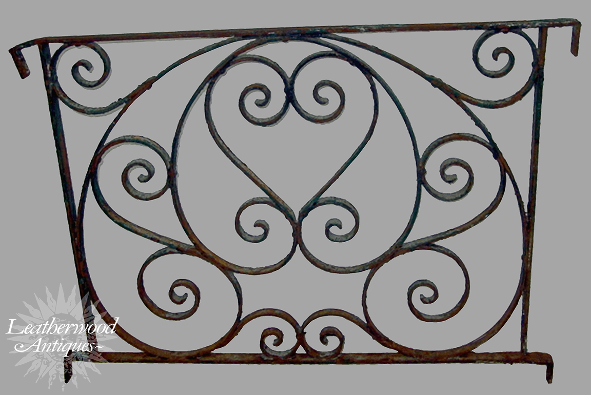 Handsome wrought‑iron grate with scrolling lines and a sweet heart at center; old blue paint lingers in the crevices, giving the surface that perfect, crusty charm. American, Late 19th Century.