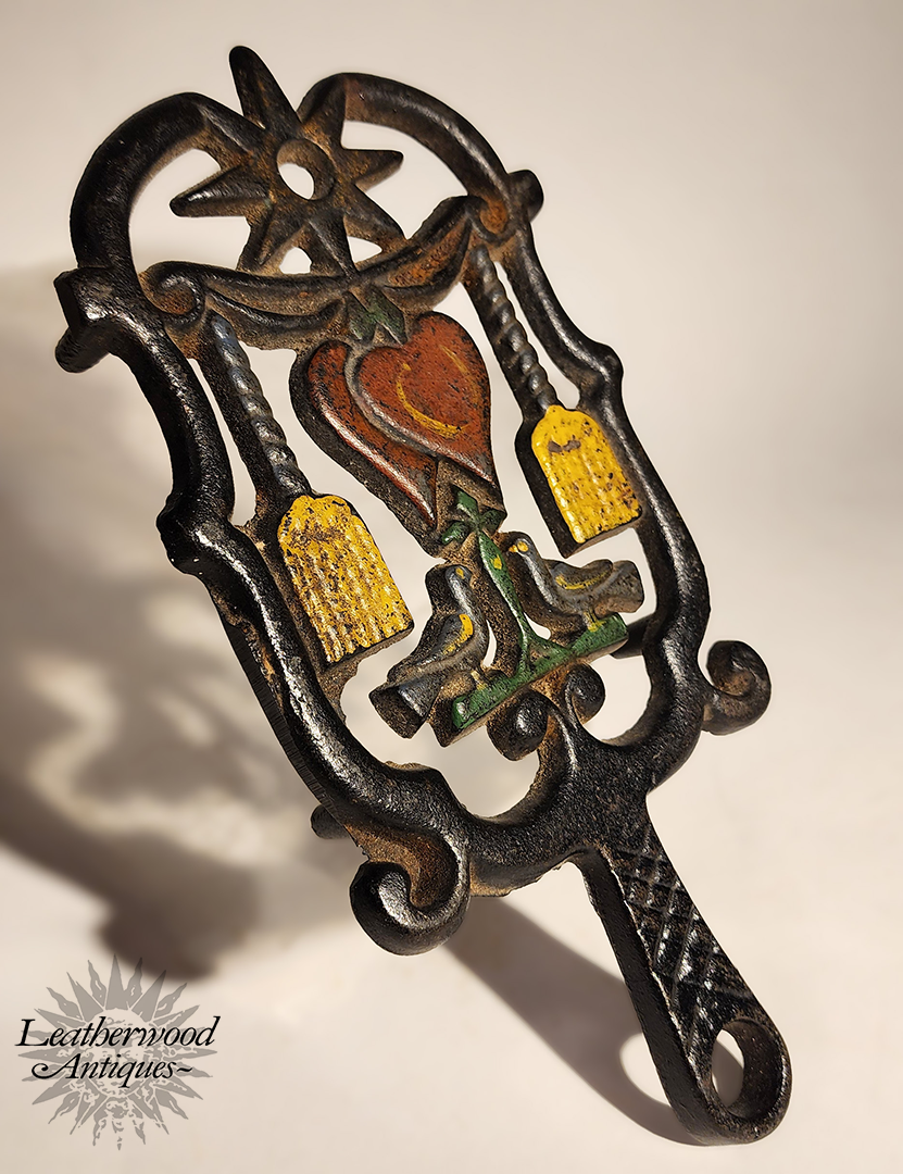 Cast Iron "love token" Trivett - two love birds (symbolize love & peace), underneath two central hearts (symbolize love & affection) and a sun or star at the top, representing light and prosperity. American, Early 1900’s.