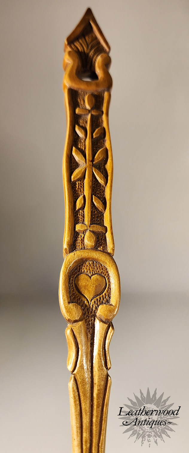 Swedish hand-carved and painted distaff love token, rich in symbolism of love and commitment. Intricate hearts and crosses reflect deep sentiment, while inscriptions like "ABV" and the dates "1892" and "10/87" hint at personal significance. A beautiful example of Scandinavian folk art traditions.