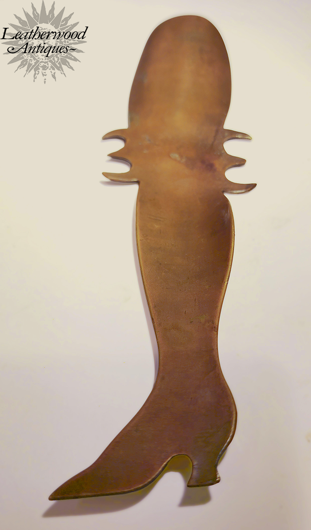 Unique and artful 19th c. brass shoehorn possibly Trench Art fashioned with lady leg and high heel shoe as a handle and decorated with flower and spiked projections with contrasting textures.