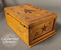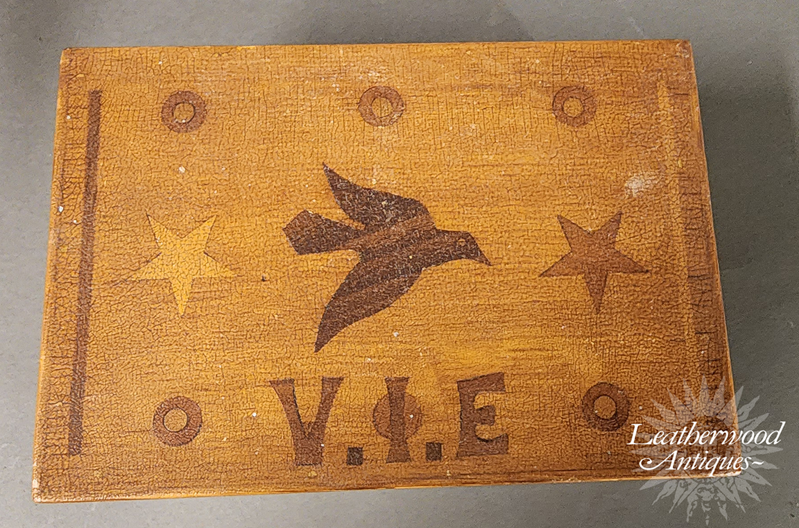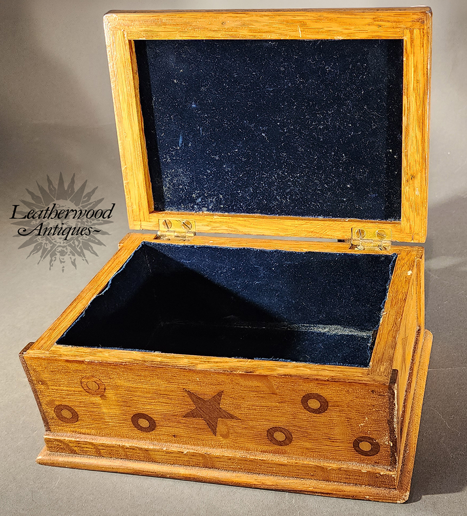 Naïve folky marquetry inlaid box rough dry surface with a bird, stars and round circles and the initials V. I. E on top. Stars and round circles adorn three sides. Dark blue velvet encompasses the inside box and lid. American, 19th c.