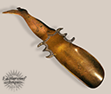 "When the beer goes in, the wit/sense goes out" ~ Translation from an old Scandinavian traditional saying on this carved & painted rosemaling dragon drinking vessel -- "Naar ölet gjeng ind, so gjeng vite ut."19th Century.