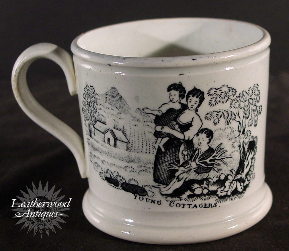 Staffordshire child’s mug, “For A Good Boy,” in a bold black transfer with three boys spinning a top. A clean early piece with lively detail and a touch of gentle praise. English c. 1840.