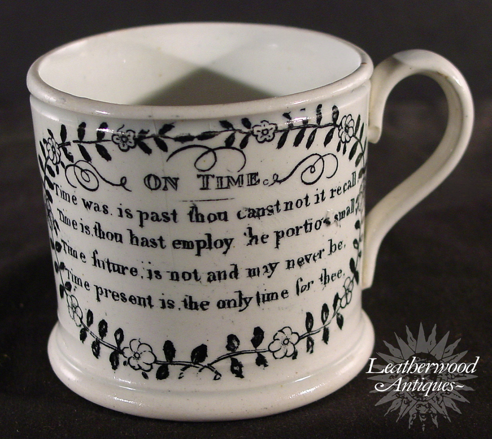 Child’s mug, “On Time,” with crisp black transfer and a framed moral verse (“Time was, is past…”). A bright early example of instructional pottery with strong graphic presence and period sentiment. English c. 1840.