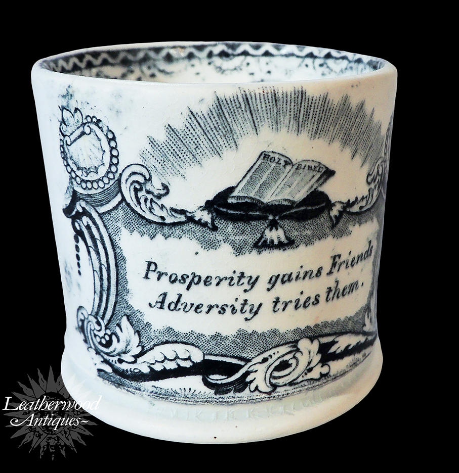 Child’s mug with open‑Bible motif and a bold black transfer proverb (“Prosperity gains friends; adversity tries them”). A striking early example of moral‑instruction