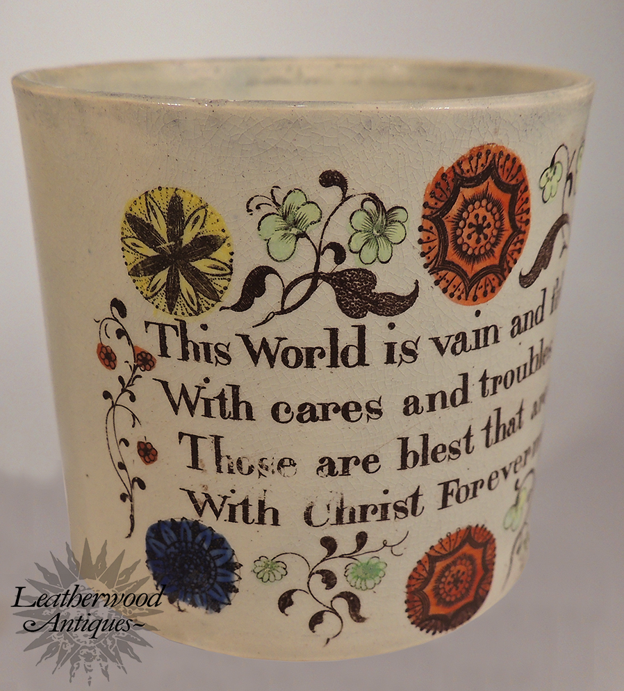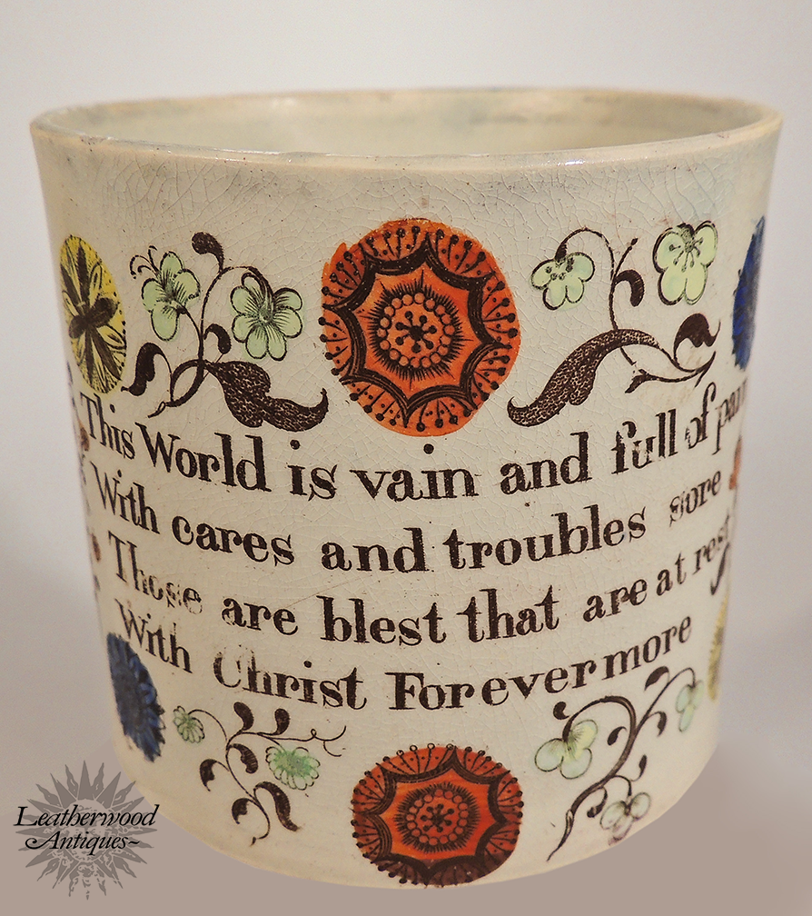 Child’s mug with polychrome decoration and a devotional verse (“This world is vain and full of pain…”). A vivid example with strong color, fine crackle, and heartfelt period sentiment. English, Late 19th Century.