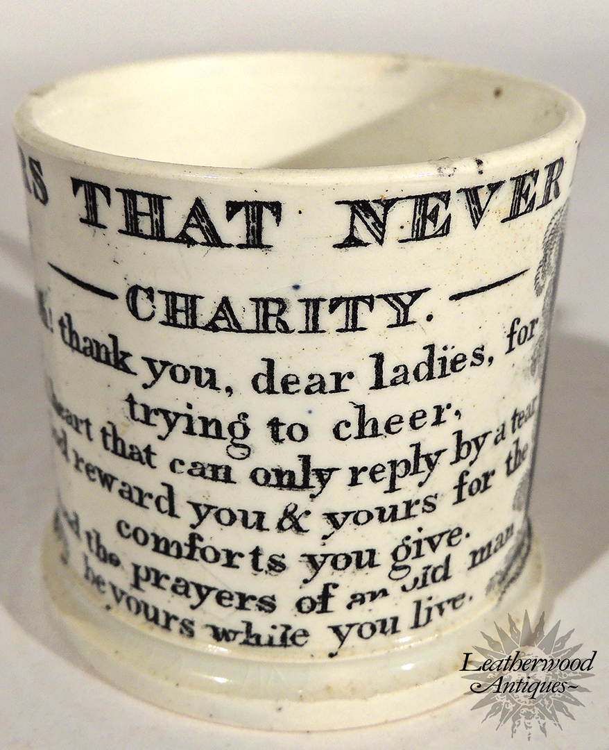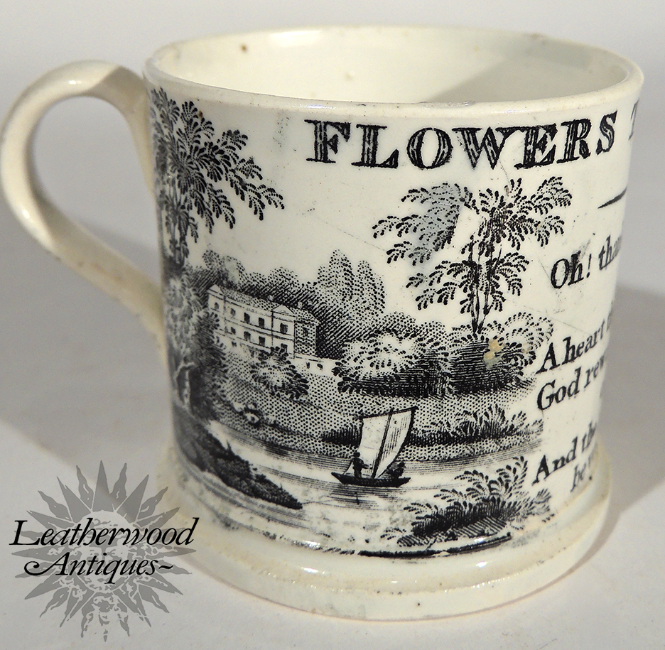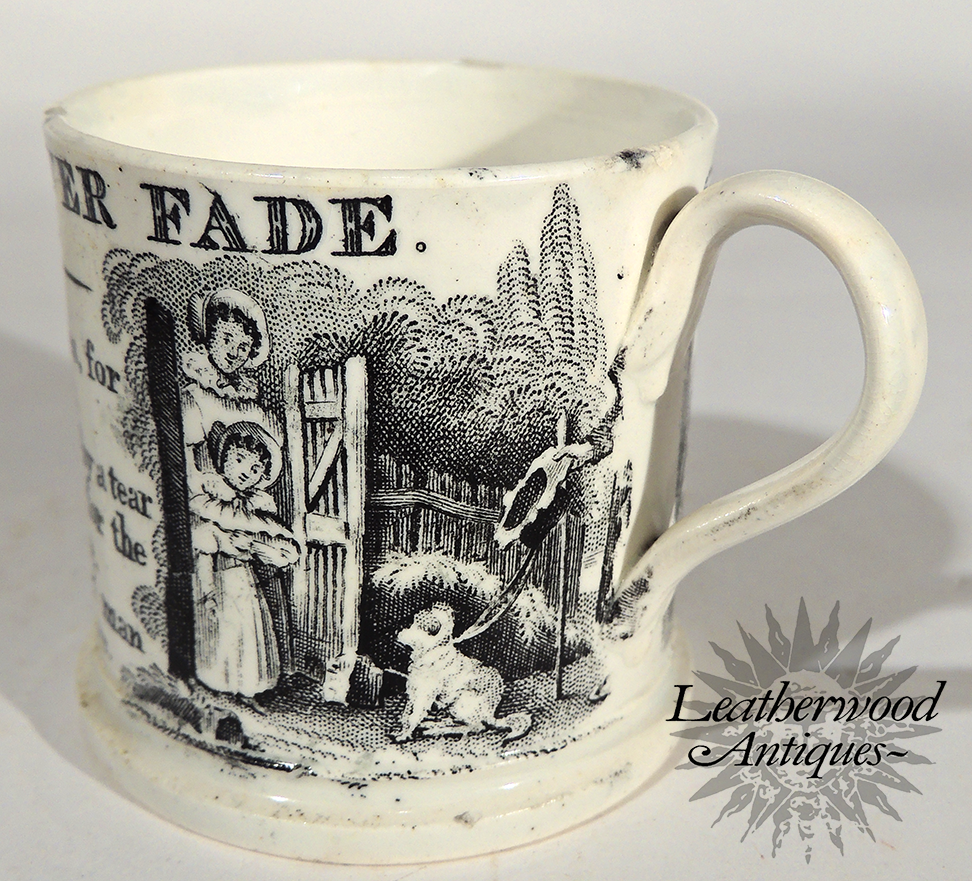 Child’s mug with a rural gate‑scene in fine black transfer and a touching verse on charity and gratitude. A piece carrying the gentle, human warmth of its time — the kind of sentiment the period called “flowers that never fade.”