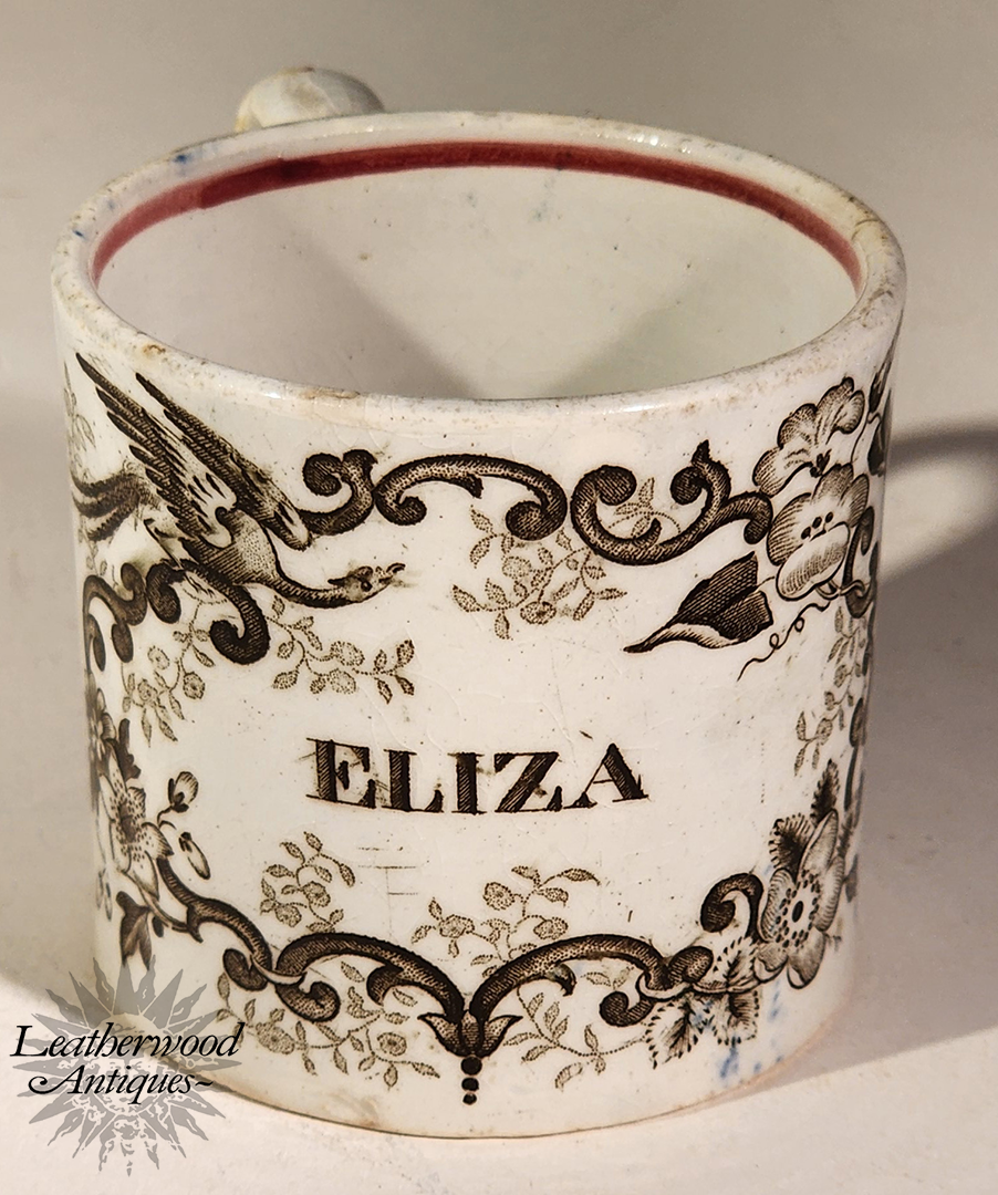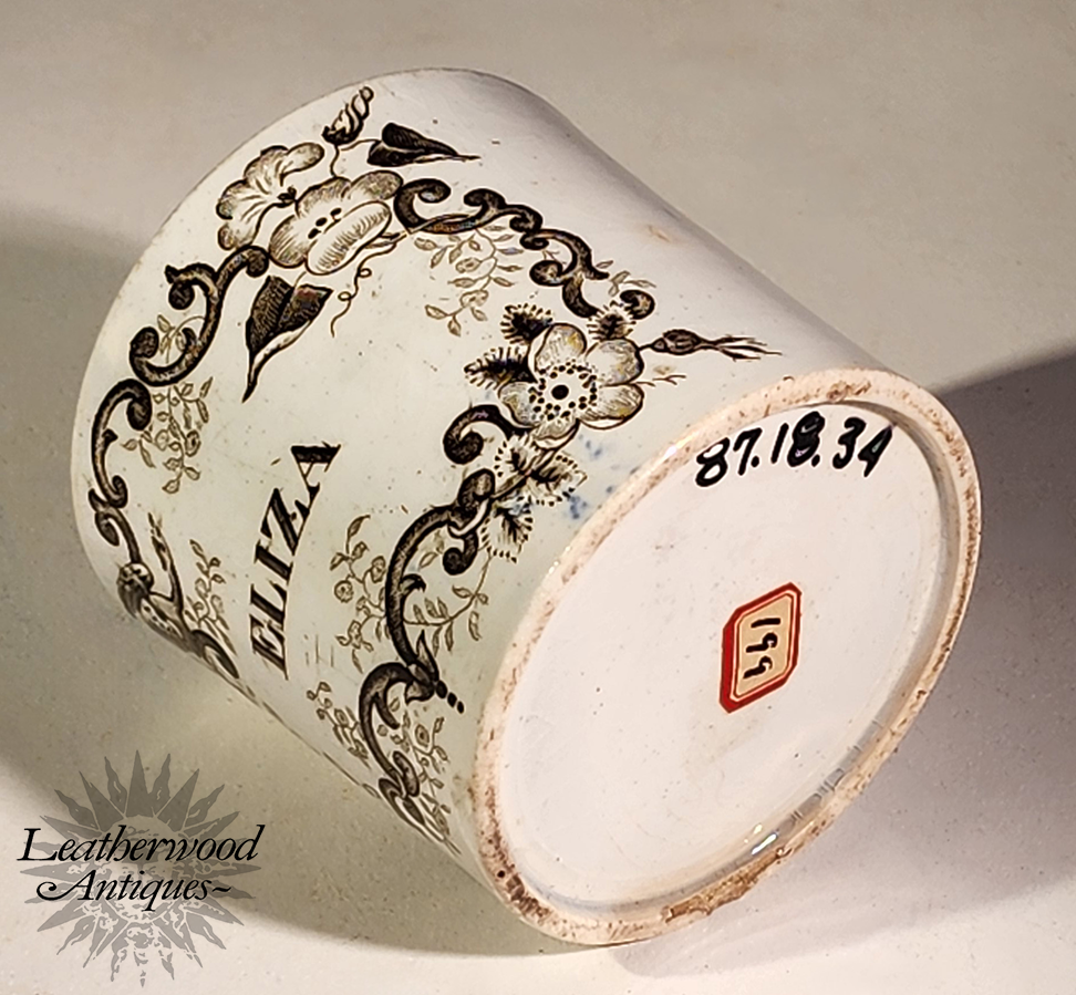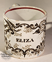Child’s mug with bold black scrollwork and the name “ELIZA” in crisp block letters, finished with a red rim line. A classic named piece with strong graphic appeal and personal charm. English, Late 19th Century.