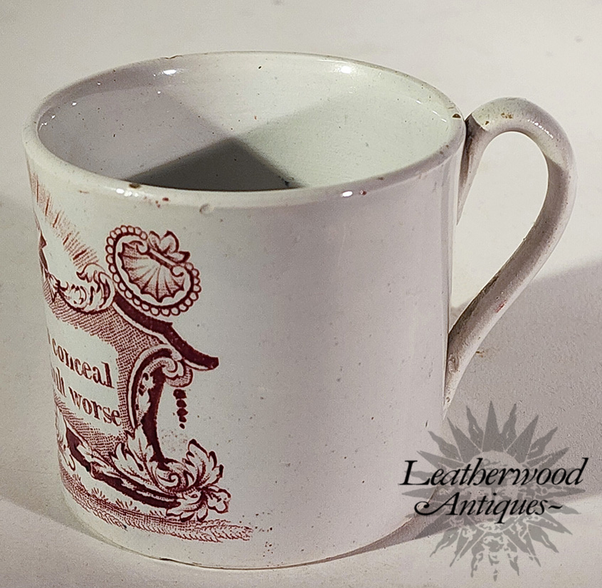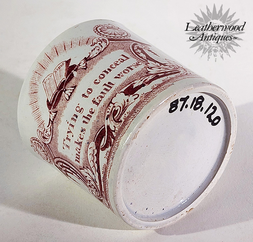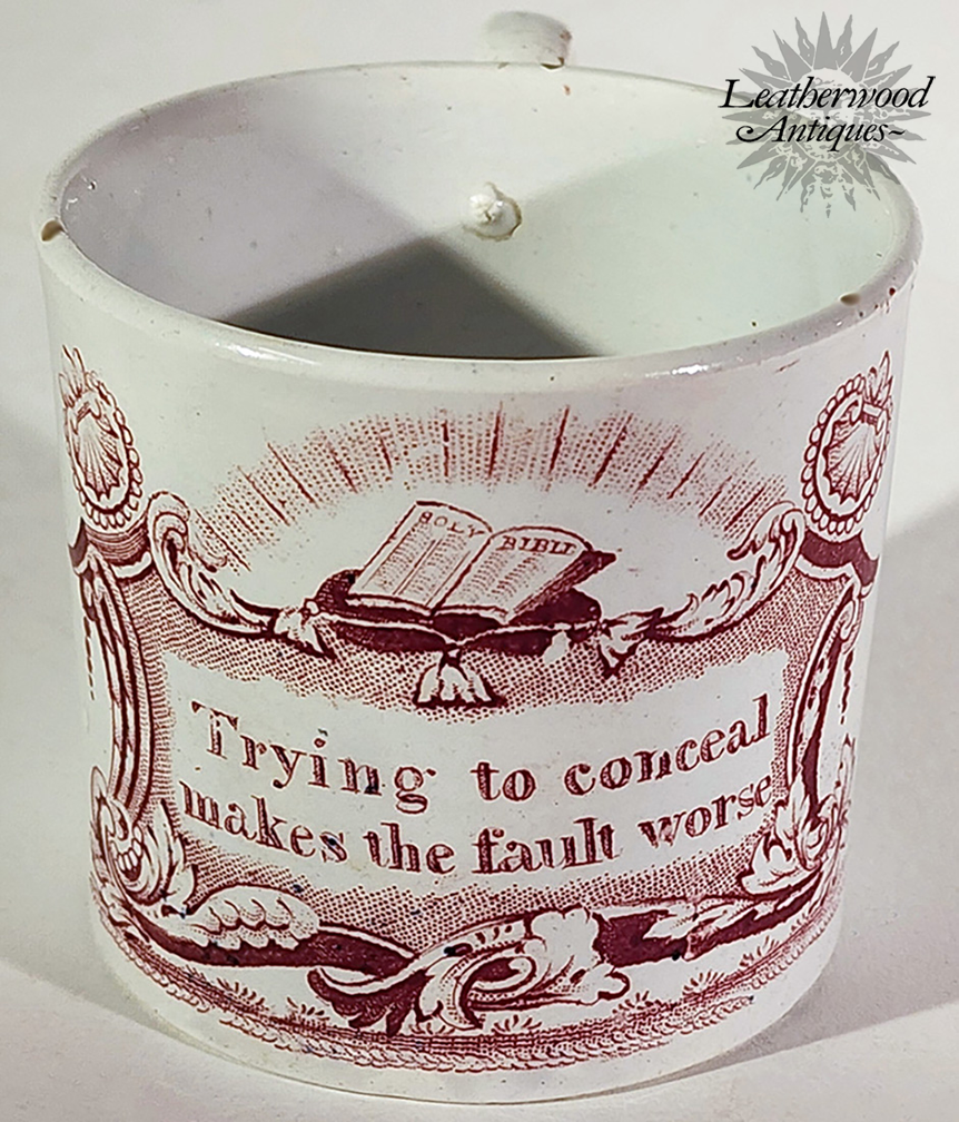 Child’s mug printed in puce with an open Bible and the maxim “Trying to conceal makes the fault worse.” A Staffordshire moral‑instruction piece, prized for its crisp color, strong graphic presence, and timeless lesson in honesty. English c. 1860.