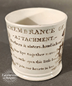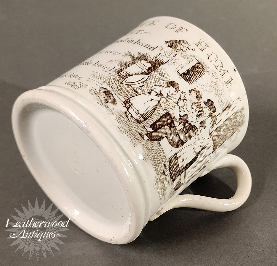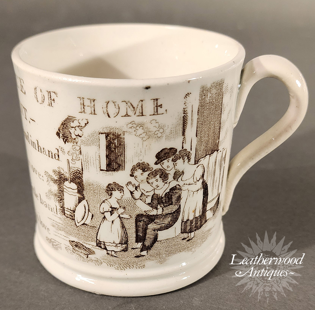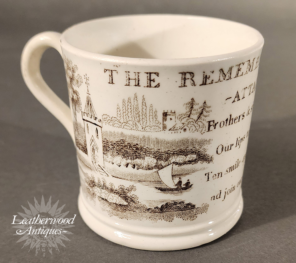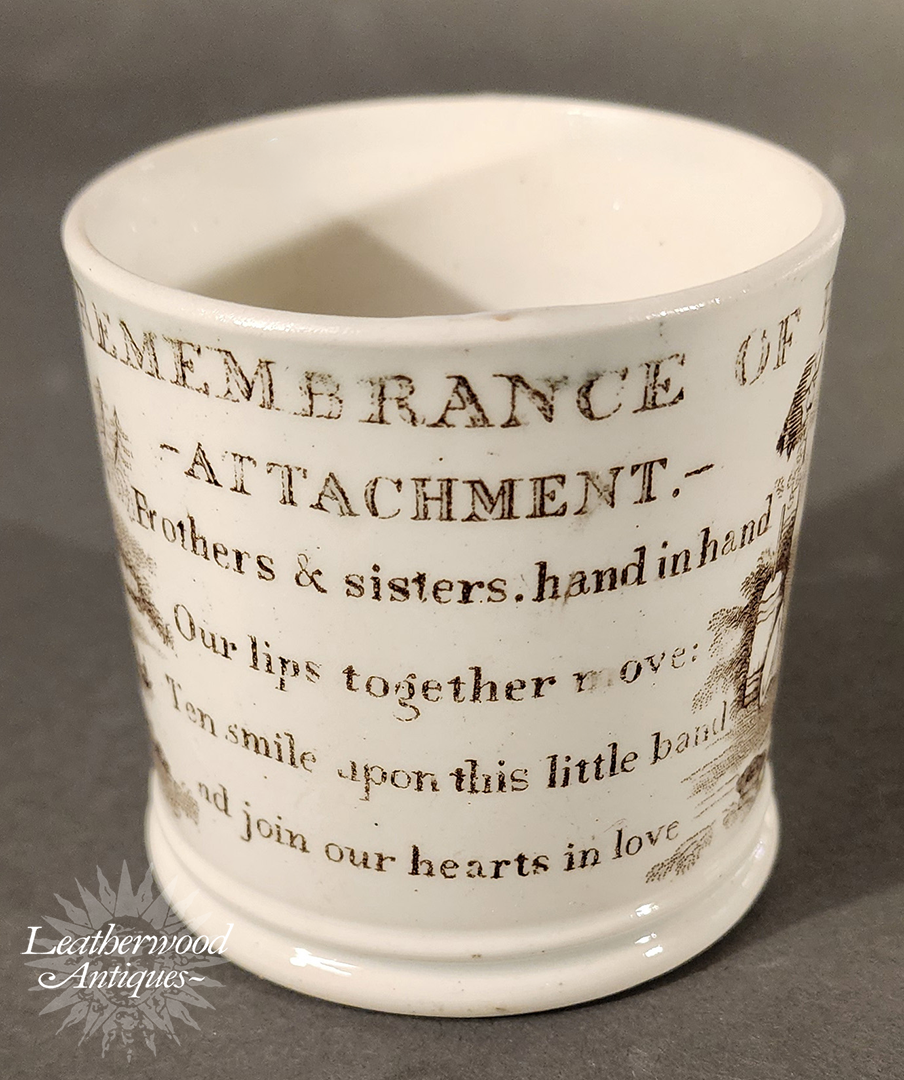 Pearlware child’s mug printed in brown with a family‑affection scene and the verse “Remembrance of Attachment… Brothers & sisters, hand in hand…” A tender piece celebrating home, harmony, and the sentimental values of the period. English c. 1830.