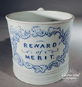 Child’s mug, “Reward of Merit,” with vivid blue transfer and classic scrollwork. A bright, charming example of early moral‑instruction ware, celebrating good conduct in the schoolroom. English c. 1830.
