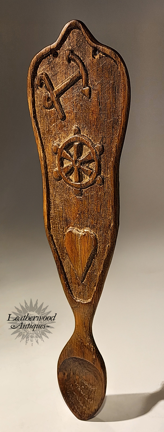 Carved love spoon (traditional Welch custom) with an anchor, ship wheel and heart. "Love token". c. 1900.