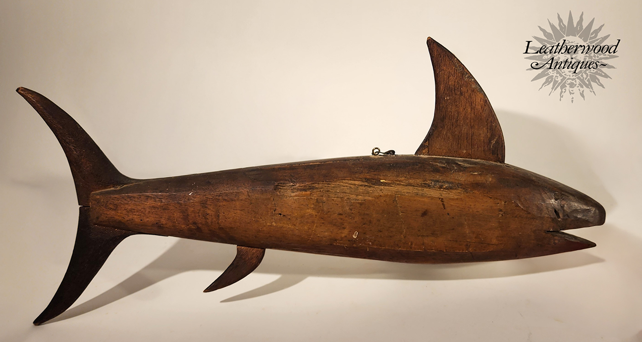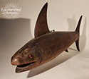 Folky carved wood stylized TUNA fish with glass eye. American, Mid-Century.
