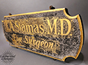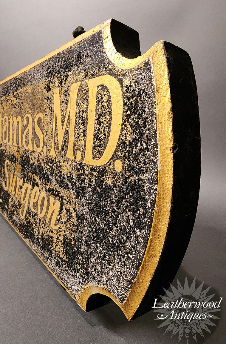 T.S. Stamas, MD - Eye Surgeon. Carved & painted double-sided sign. The plaque features a classic scalloped silhouette with hand-painted gold lettering set against a textured black background. The surface shows age-related wear, patina, and speckling which add to its authentic period character. American, Mid-Century.