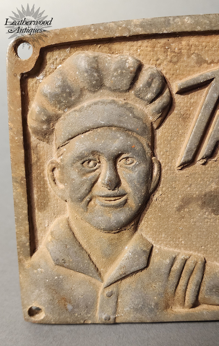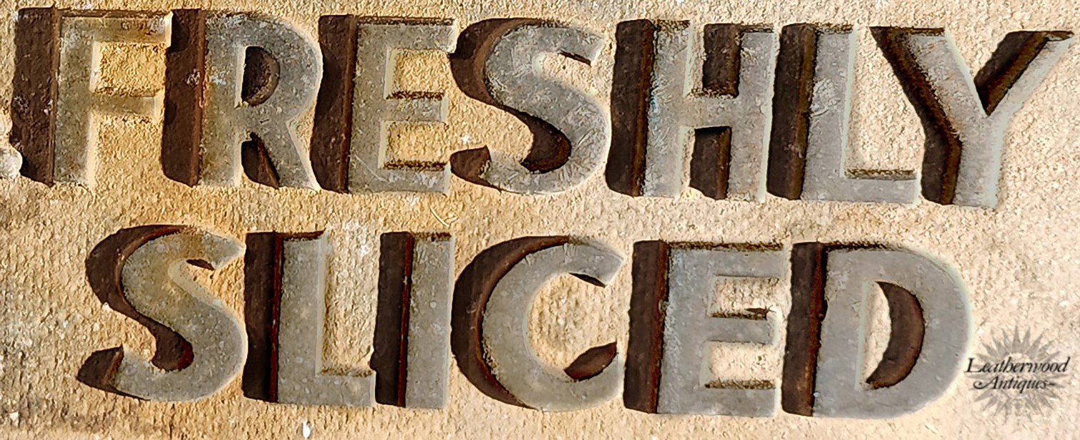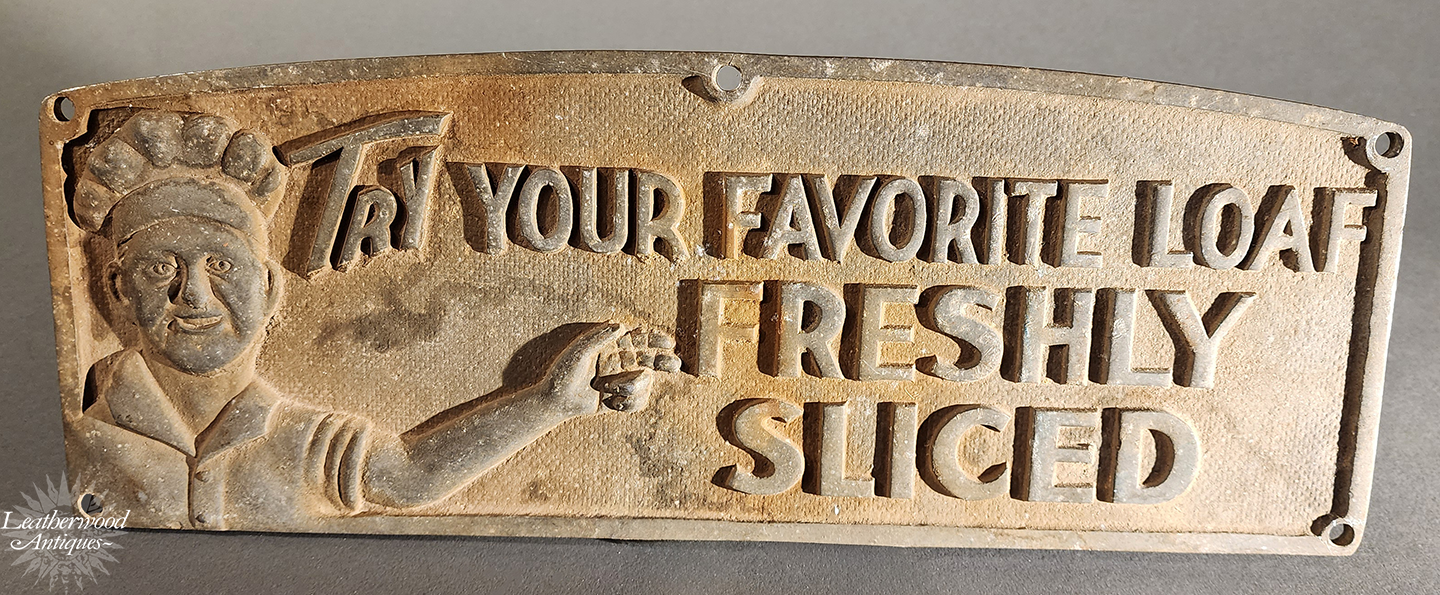 Weathered Metal Trade Sign— “Try Your Favorite Loaf — Freshly Sliced.” Embossed with bold lettering a classic Americana shop appeal.. Early 1900's.