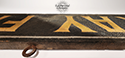 Two carved & painted / gilded wooden panels ~ MUSIC / HALL each panel has a raised border with ornate edges. The edges have a scalloped design, embossed Gothic-style font letters and crusty great surface..