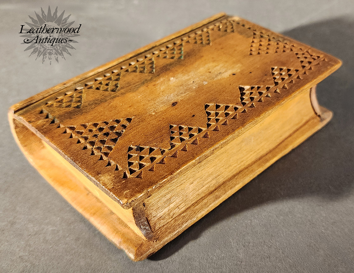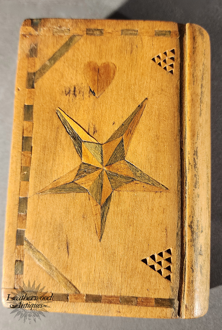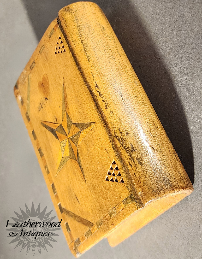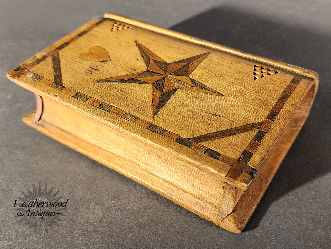 19th c. American folky and unusual book shaped spruce gum box with wonderful, star and heart inlays and geometric chip carving on the other side.