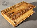 Superb 19th c. American spruce gum box shaped like a book, featuring a rugged surface, intricate relief carvings, and sap/gum decorations with hearts and geometric patterns.