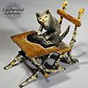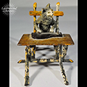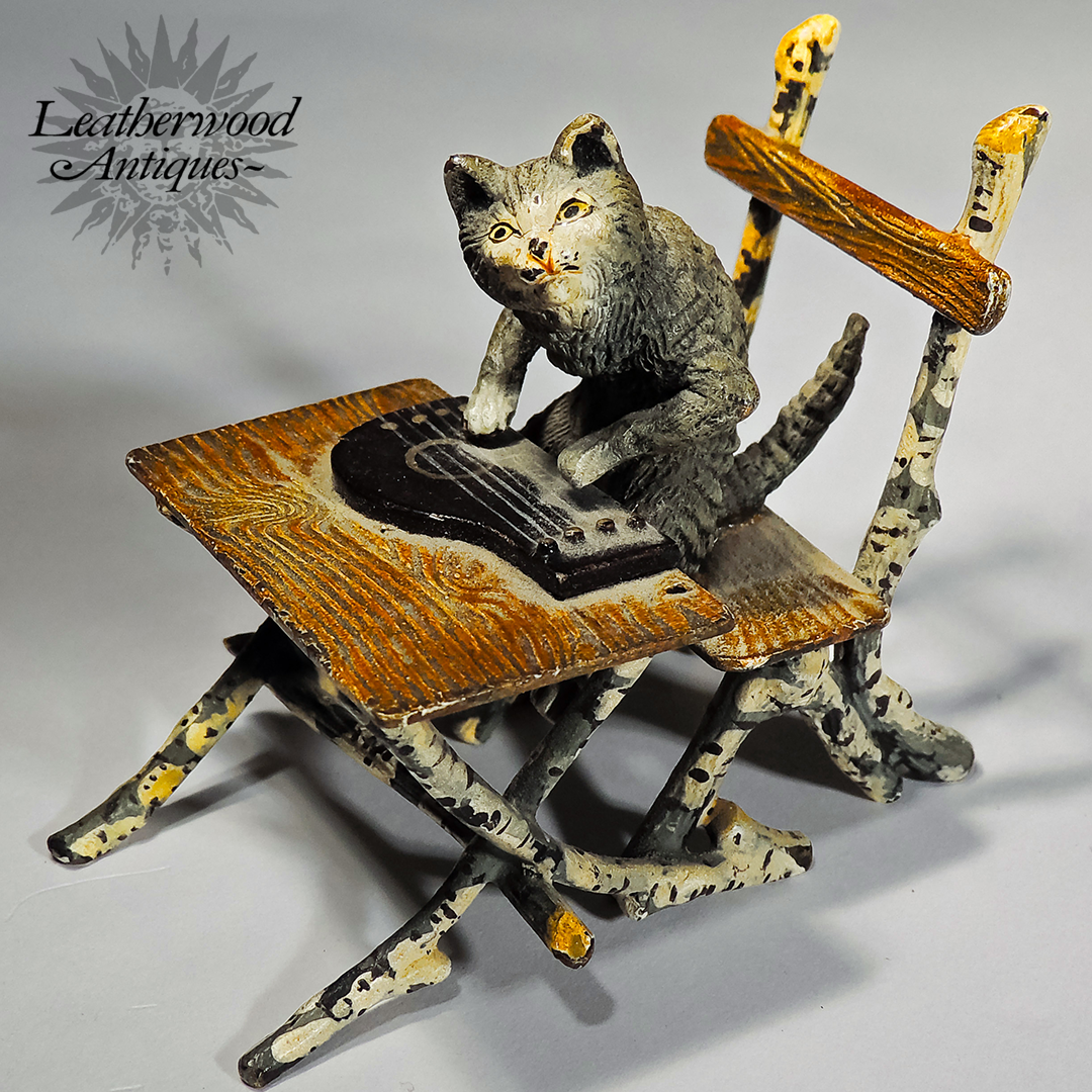 Cold-painted Vienna Bronze cat musician playing on a Zither (string flat instrument) sitting on a rustic chair and table. c. 1900.
