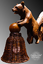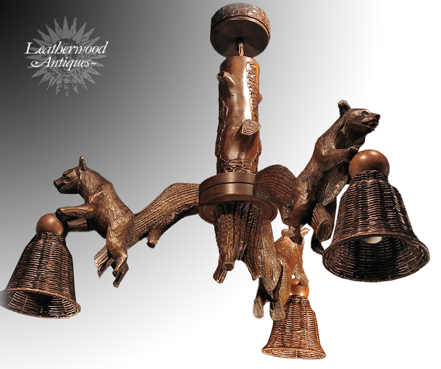 Whimsical Bear Chandelier comprising of three bears riding tree branches & holding balls with bell shaped wicker shades; electrified for the American market. Swiss, Early 1900's.
