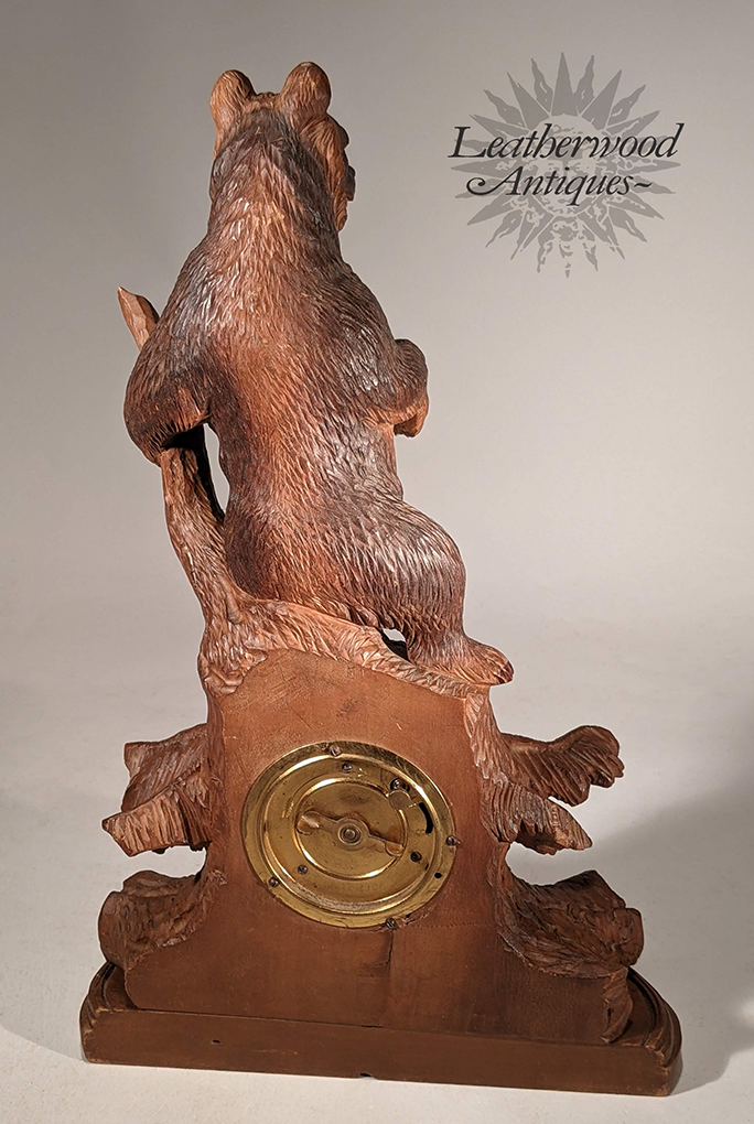 Carved two-toned cute Black Forest bear with glass eyes standing on natural forest patch with clock (needs work). Swiss c. 1890.
