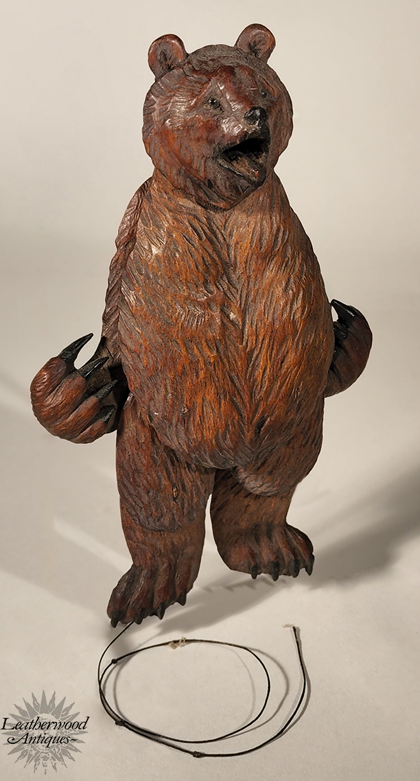Superbly carved hiking bear box in walnut with two-tone staining, pick in hand, backpack & leather pouch. Great body & facial expression. Swiss c. 1899.