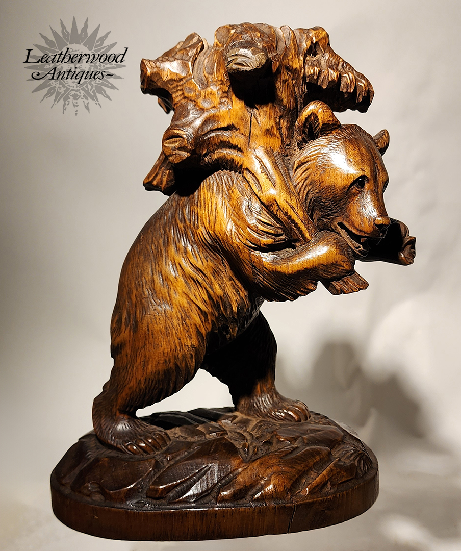Finely carved Black Forest walnut bear with glass eyes carrying stacks of wood branches fashioned as a pot / bowl on his back. Swiss, Late 19th Century.