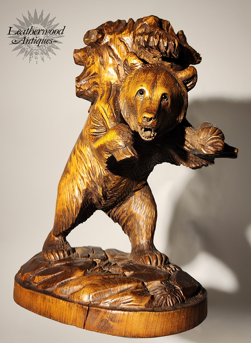 Very rare & special Black Forest carved bear with great details & a story. The bear wears glasses & has a letter in its hand & a Napoleonic type hat in the other. Lots of details all around. Swiss, Late 19th Century.