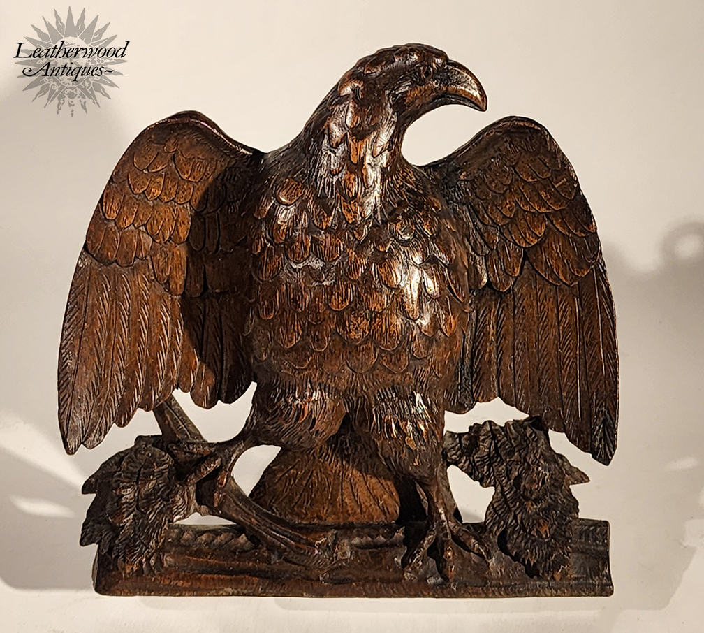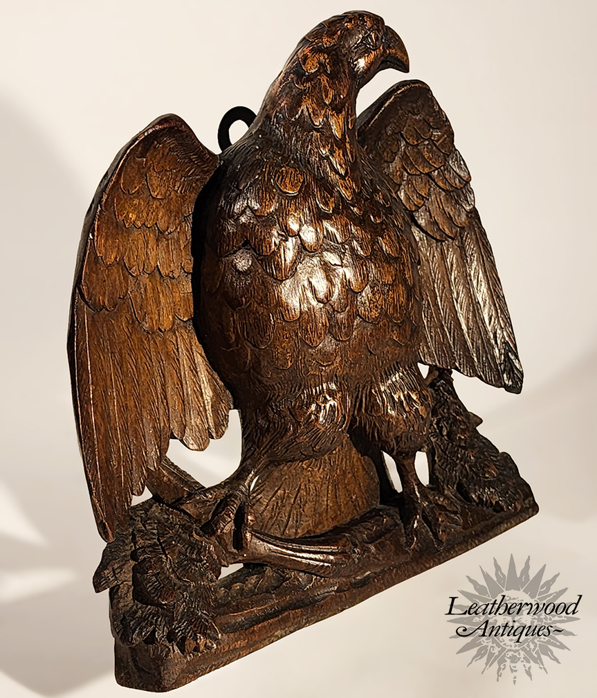 A finely carved small eagle with rich feather detail and a strong, alert presence. Flat‑backed for versatile display—hang it on a wall or stand it on a desk. Swiss, Late 19th Century.