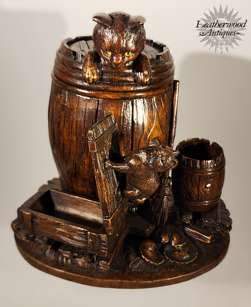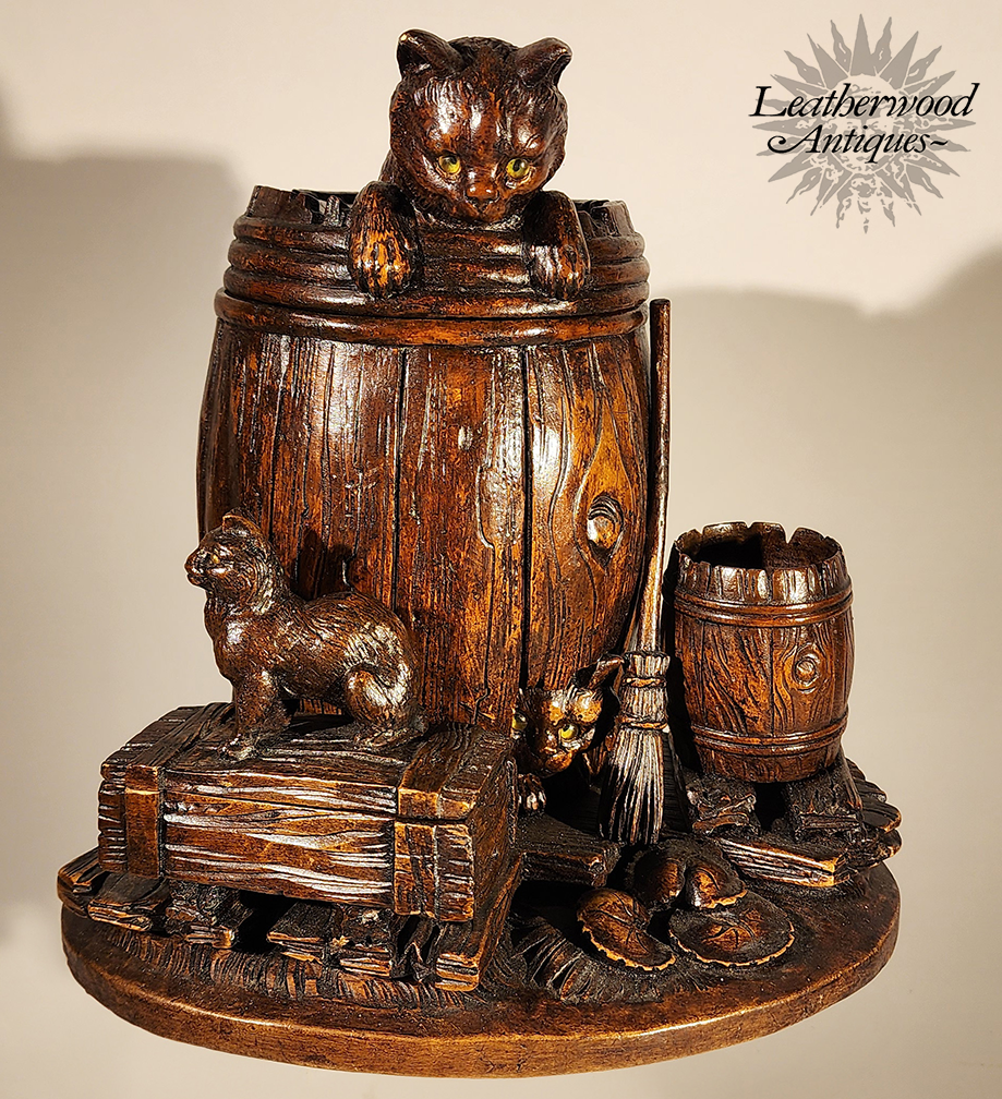 Black Forest Tobacco Box in the shape of barrel with a cat coming out of a hole within the barrel’s base. The barrel opens from the top with a hinge. Swiss c. 1880.