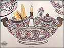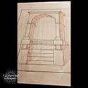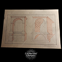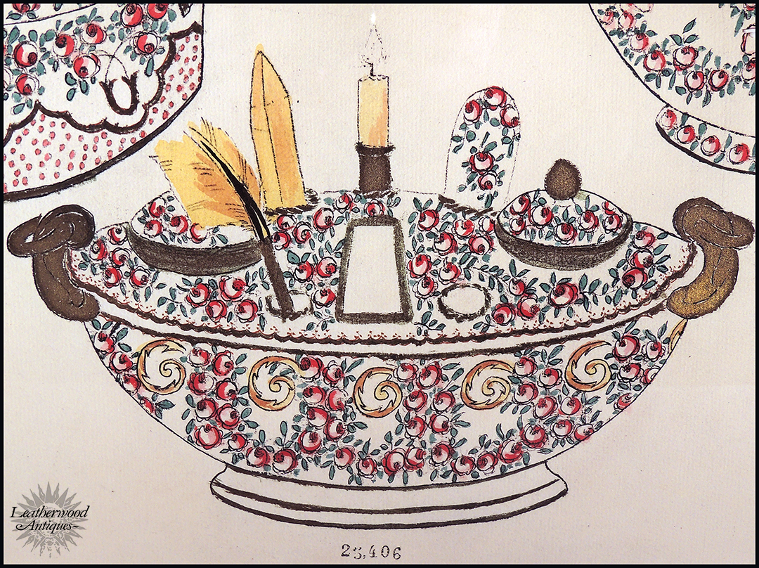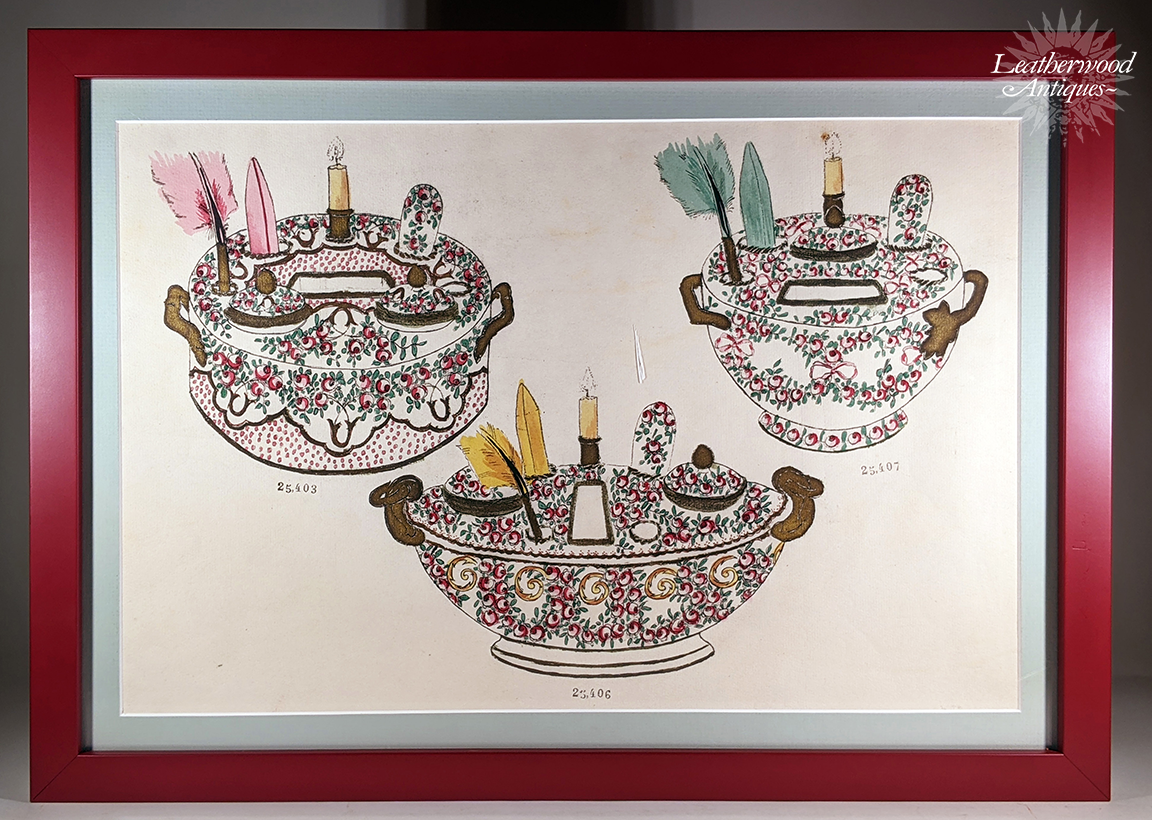 Watercolor & Ink factory pattern sheet that illustrates three "standishes"—specialized multi-component desk sets designed for the Regency-era writer. Each vessel incorporates a central taper-stick for sealing wax, lidded reservoirs for ink and pounce, and conical holders for quill pens. Decorated with delicate "French Sprig" florals and ornate gilded scrolls, these designs represent the height of English Bone China production. The specific pattern numbers (25405–25407) served as a vital reference for factory artisans, ensuring decorative consistency for luxury commissions. The watercolor housed in later frame.