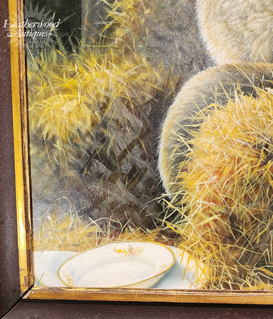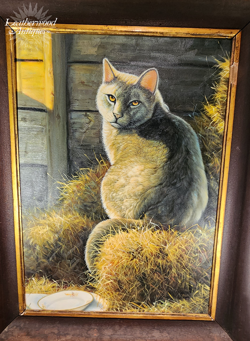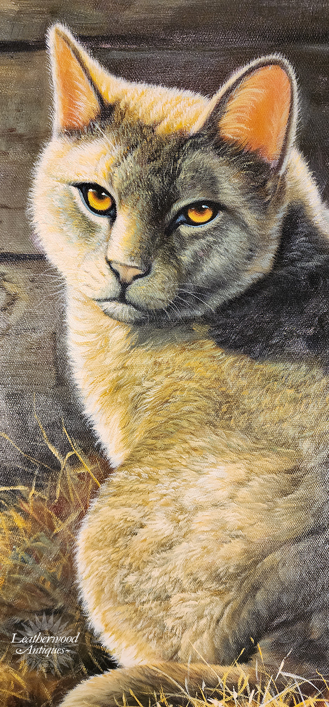 This stunning oversized oil painting brings a touch of rural serenity home. A beautiful grey cat sits perched in a quiet barn corner, illuminated by a warm glow that highlights the intricate detail of the hay and the delicate porcelain saucer at its feet. American, Early 20th Century.