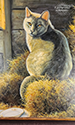White cat and a bird's nest by DENISE CALLA ~ Signed lower right. Inscribed in pen verso "For: Priscilla Jean, The Angel Girl". Oil on breadboard. American.