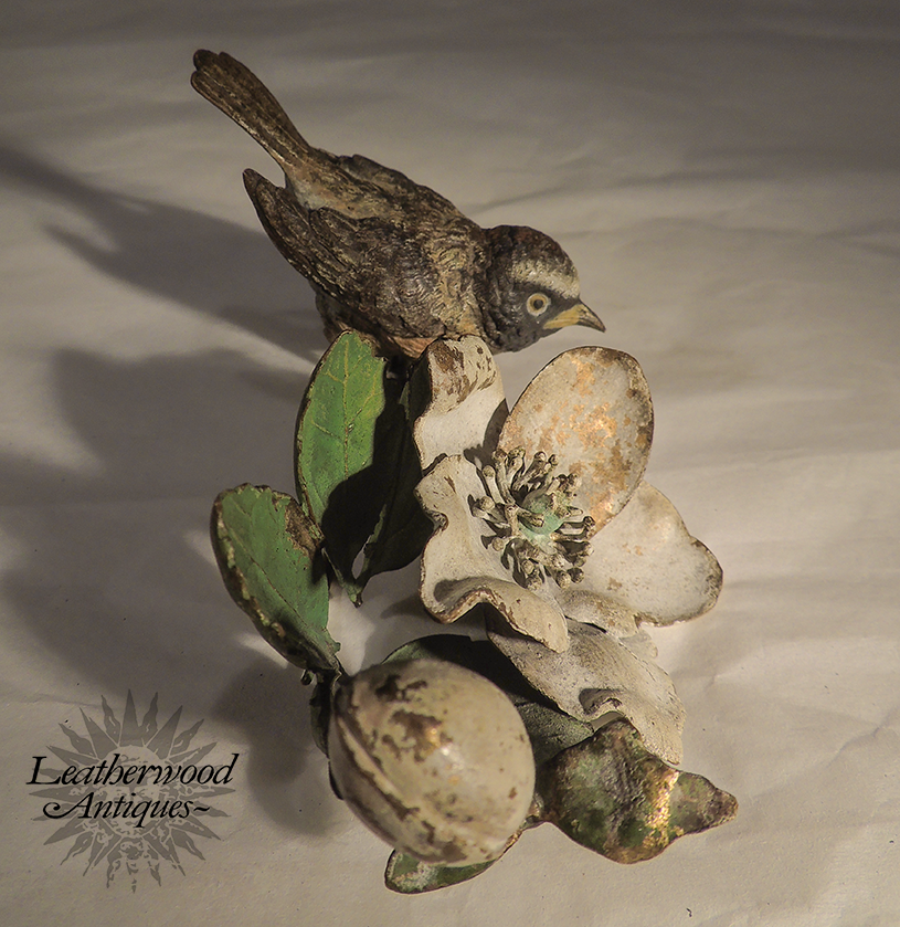 Vienna Bronze bird (possibly American Robin) on a dogwood branch with flowers. c. 1900.