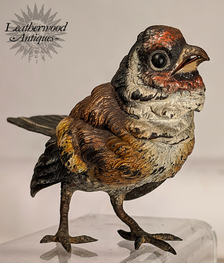 Red-breasted well-formed cold-painted Vienna Bronze bird ~ nice surface. Stamped ''Geschutz'' underneath tail. c. 1880.