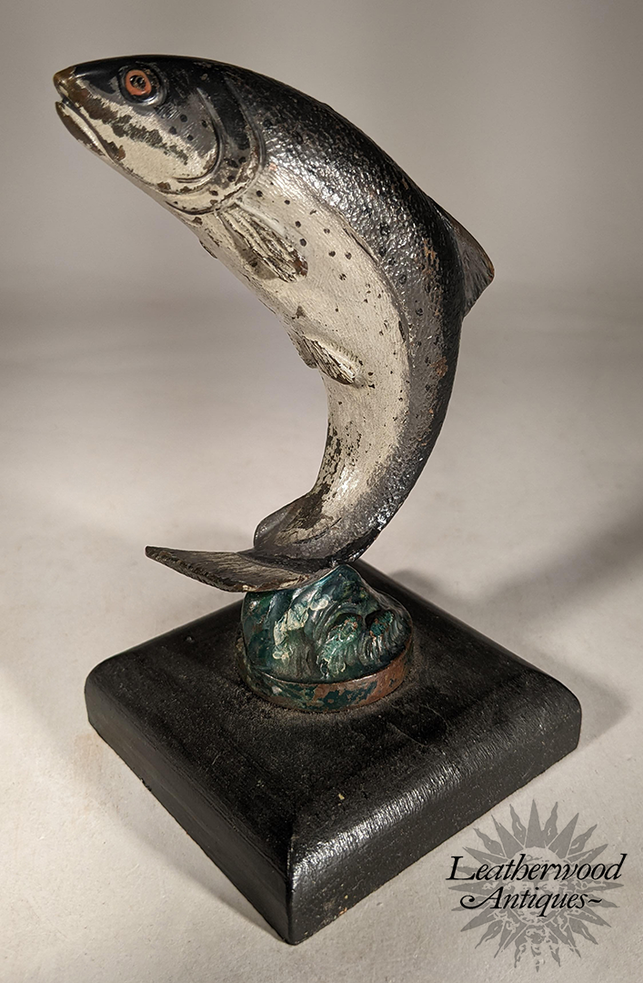RARE cold-painted VB car mascot of a leaping fish on a later wooden display base. c. 1930.