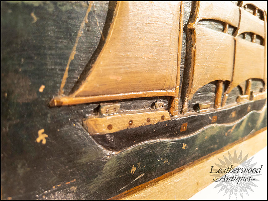Folky carved with original paint open "ship" diorama with the name Leland painted on the bow. American c. 1900.