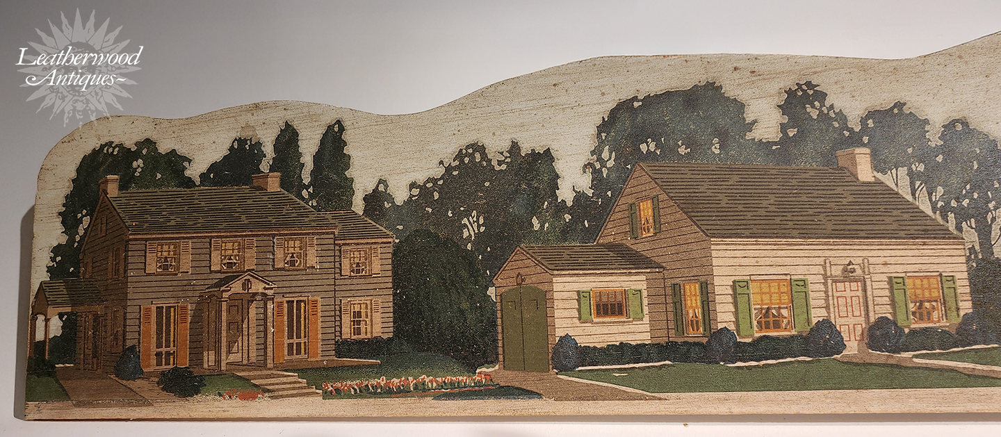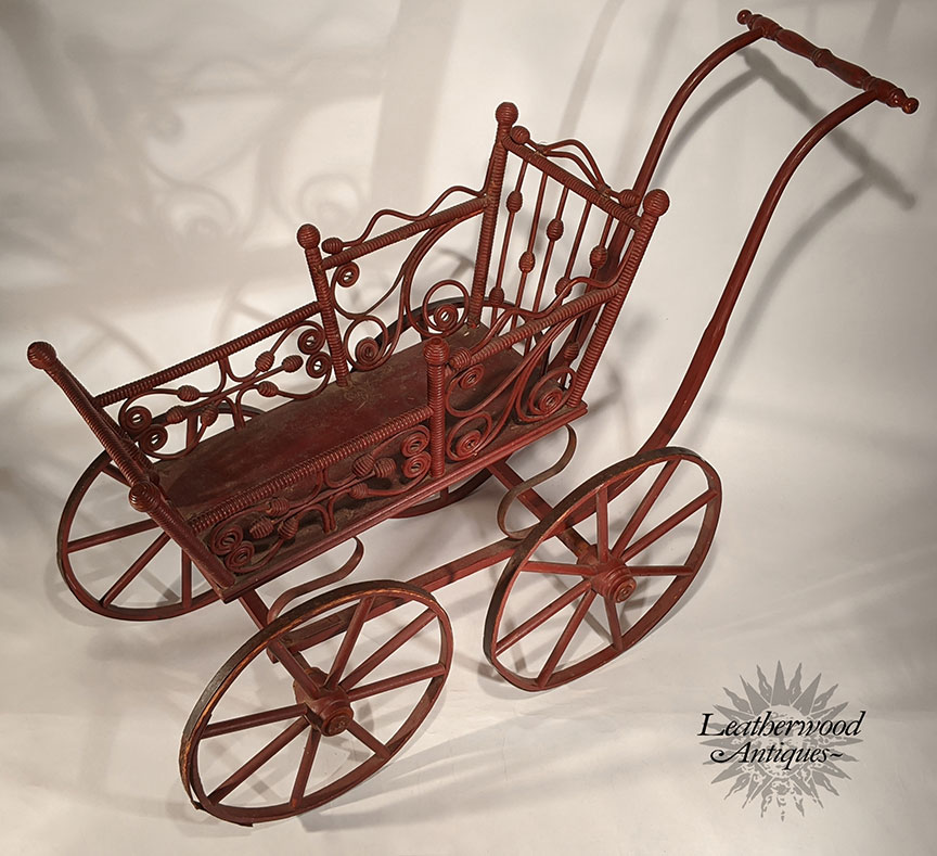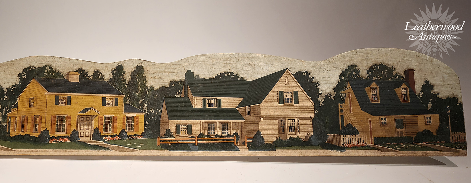 Charming folky painted doll house cupboard with the use of spools, picture frame, etc. & notice the lace painted windows. The house name, "Swiss Cottage". English c. 1870.