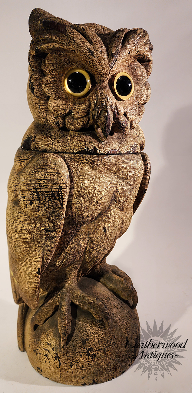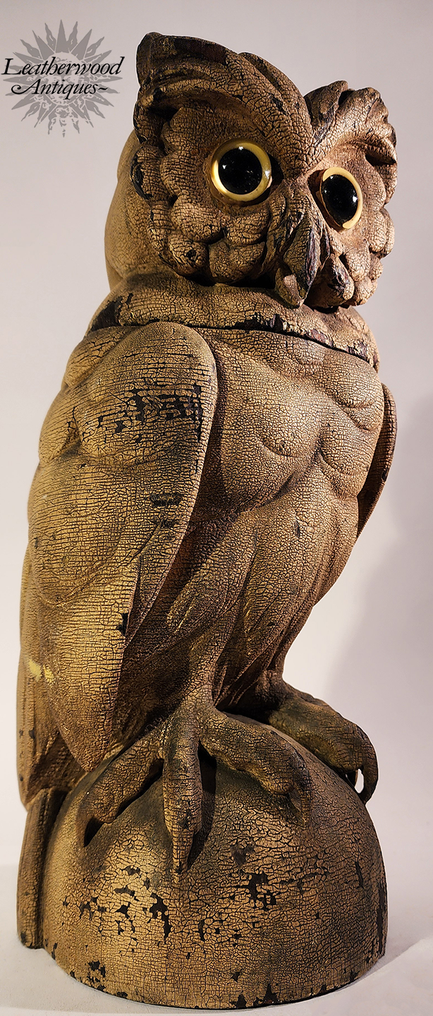 Large American 19th c. carved & painted owl tobacco box with great crusty surface, open beak & glass eyes.