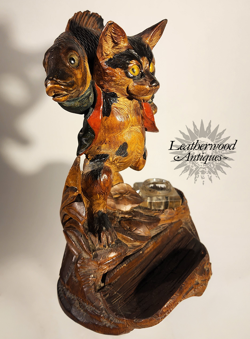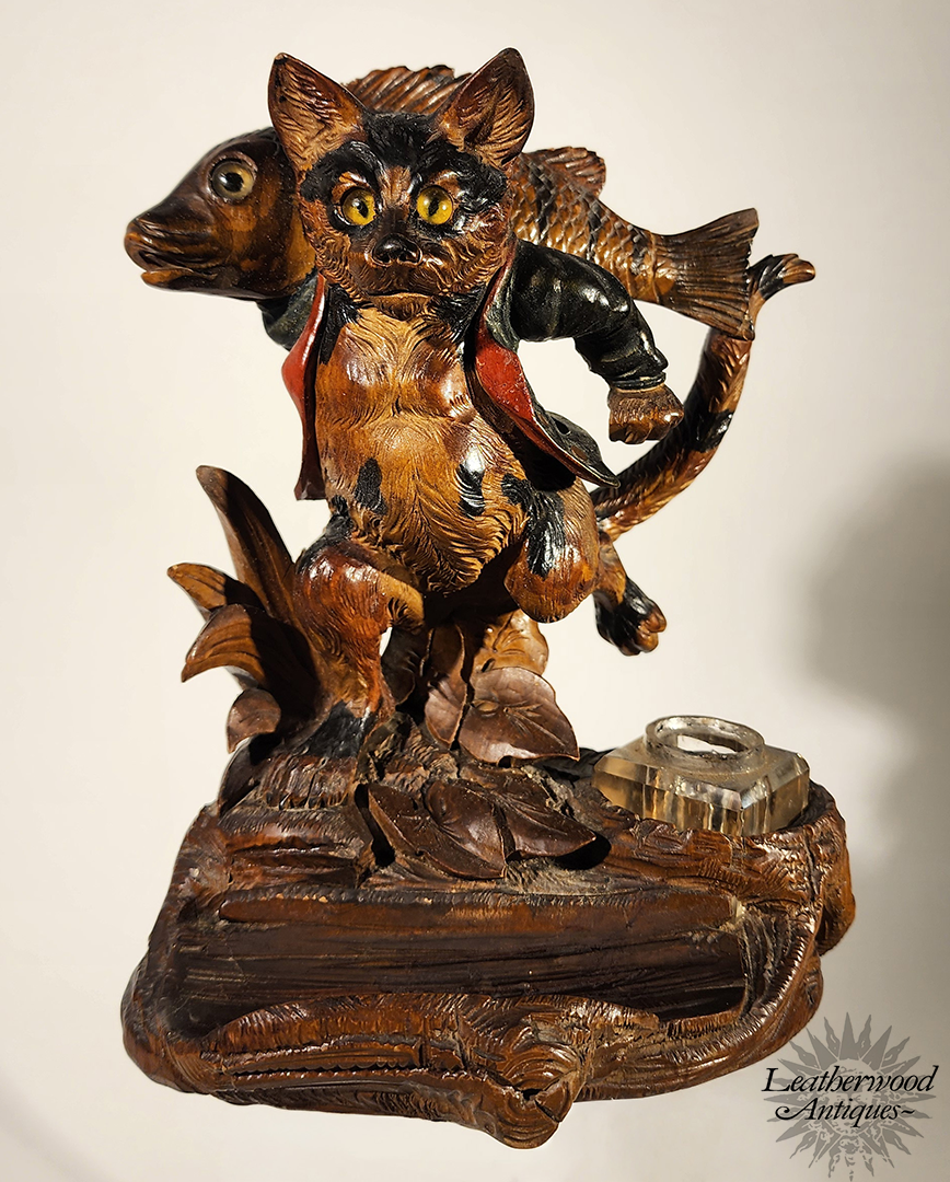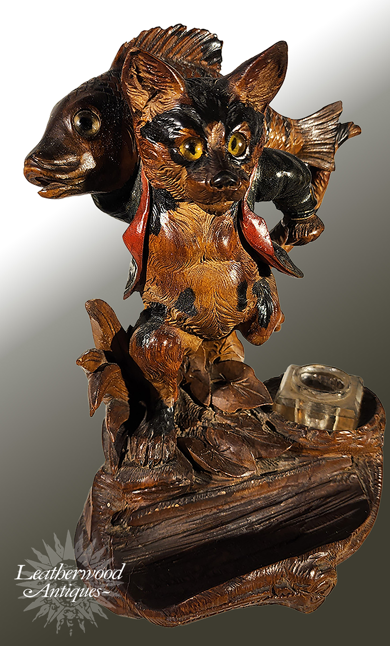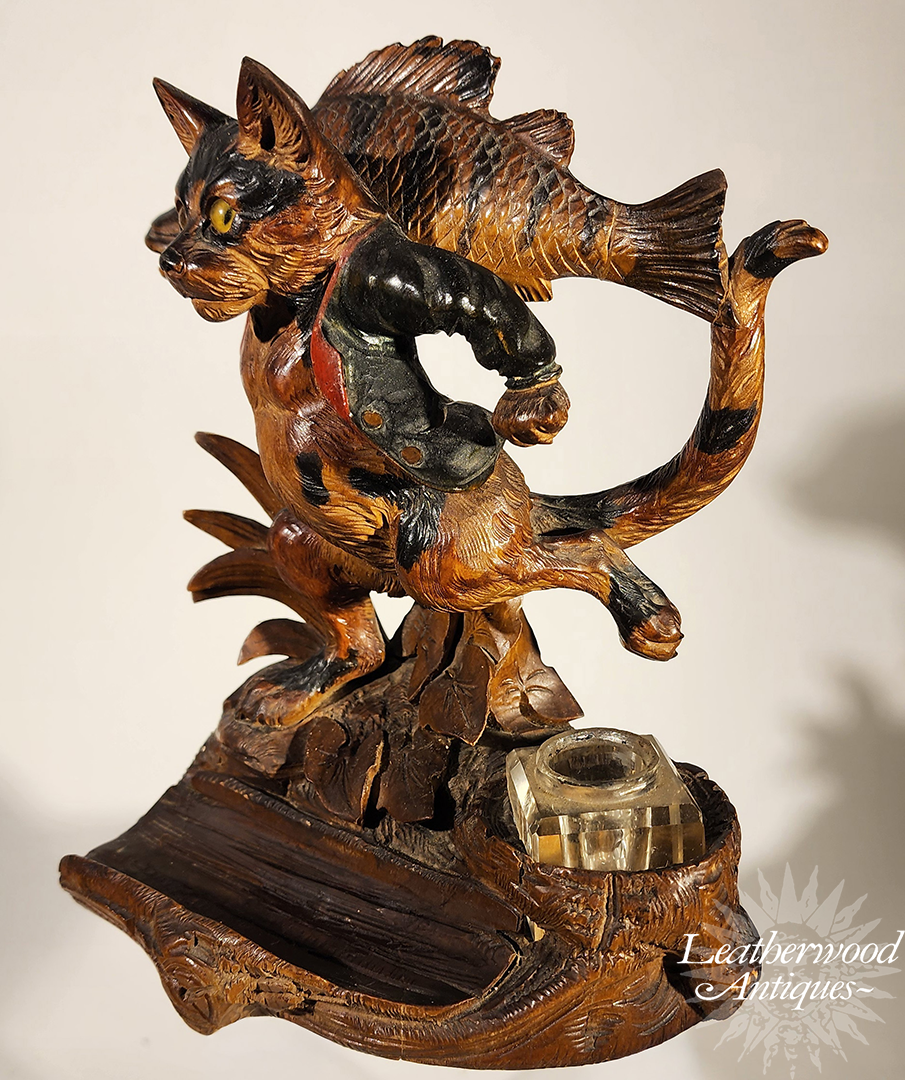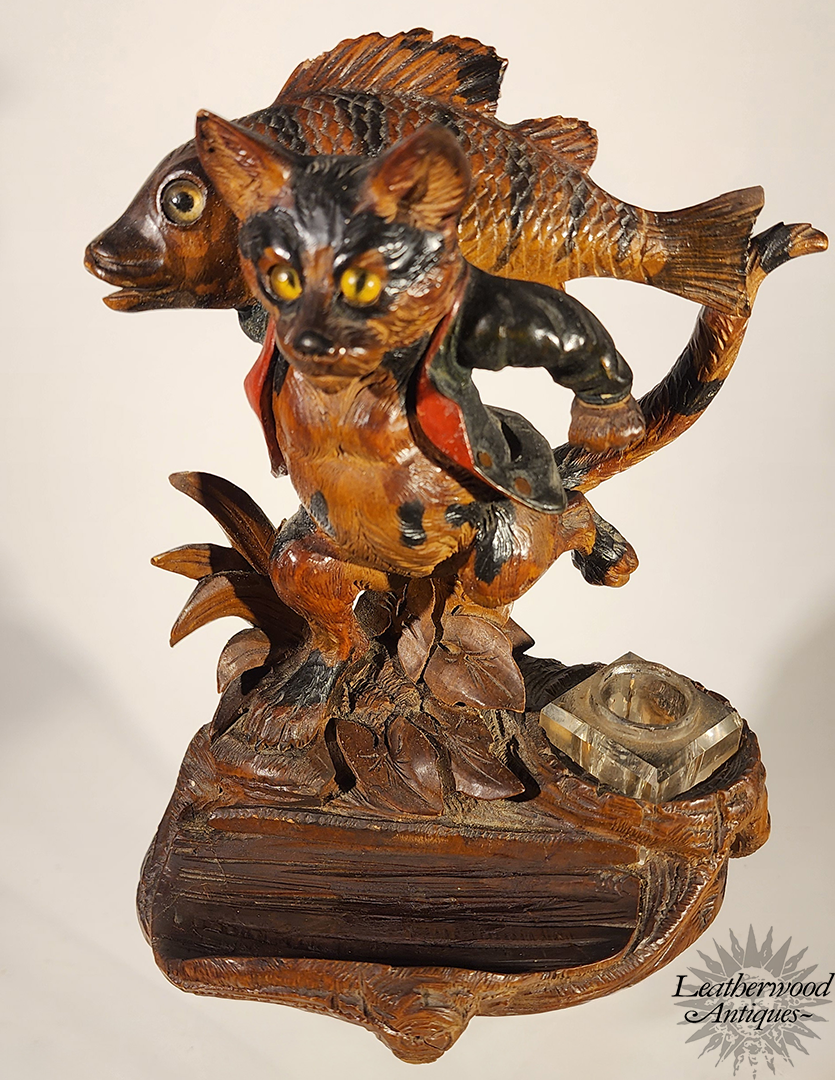 Dressed CAT carrying a big FISH on its back Black Forest most unusual sculpture inkwell. Swiss, Late 19th Century.