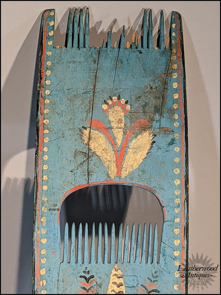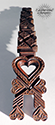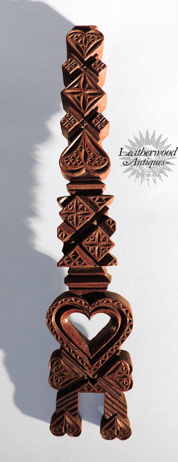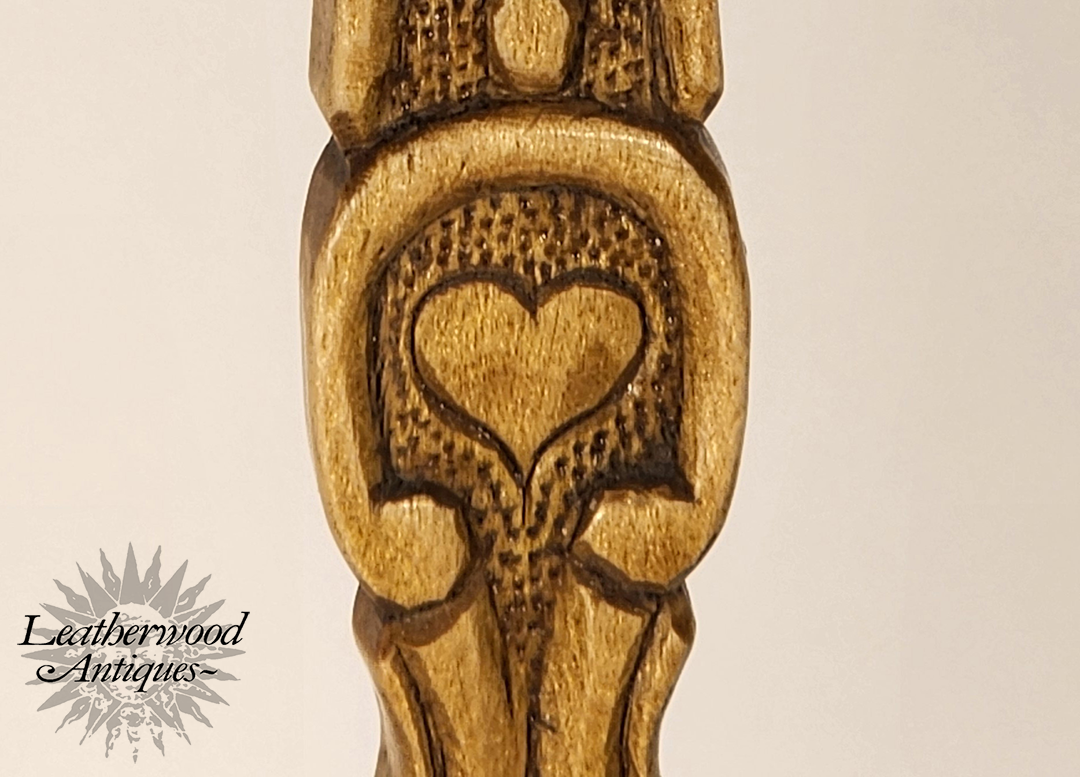 Swedish hand-carved and painted distaff love token, rich in symbolism of love and commitment. Intricate hearts and crosses reflect deep sentiment, while inscriptions like "ABV" and the dates "1892" and "10/87" hint at personal significance. A beautiful example of Scandinavian folk art traditions.