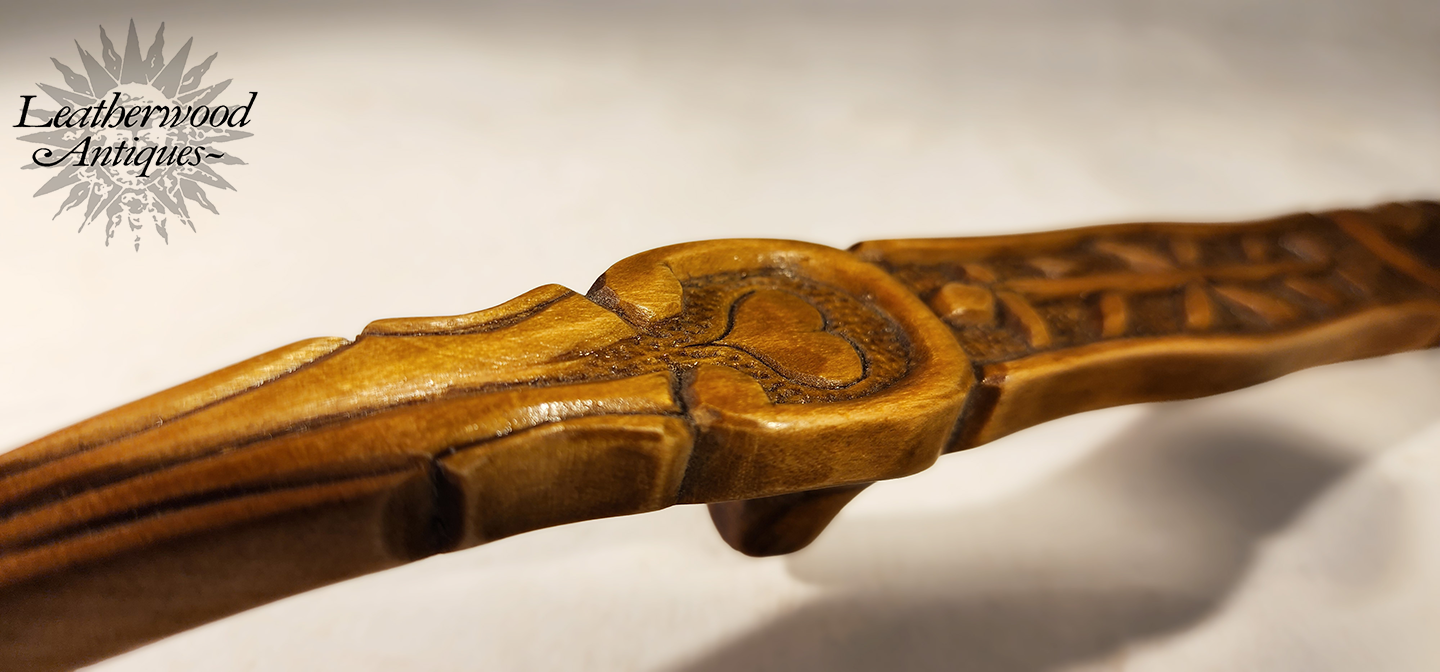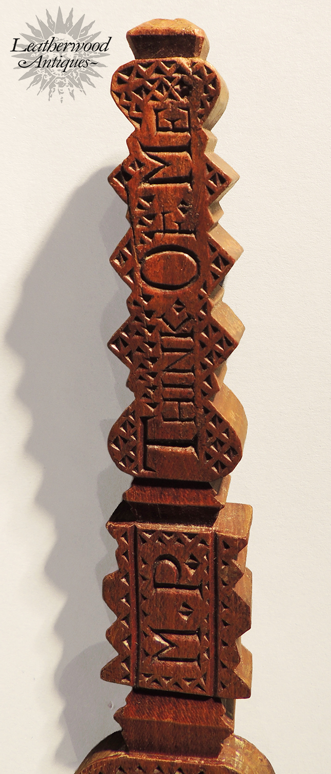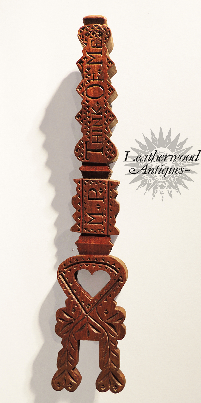 Rare English love‑token knitting sheath, c. 1780, carved in a soft curve and filled with nesting hearts; a symbolic keepsake rather than a working tool. One side carries the tender motto “Think of Me” alongside the initials M.P., giving it a wonderfully personal touch.