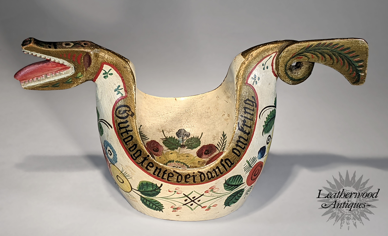 "When the beer goes in, the wit/sense goes out" ~ Translation from an old Scandinavian traditional saying on this carved & painted rosemaling dragon drinking vessel -- "Naar ölet gjeng ind, so gjeng vite ut."19th Century.