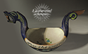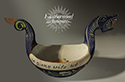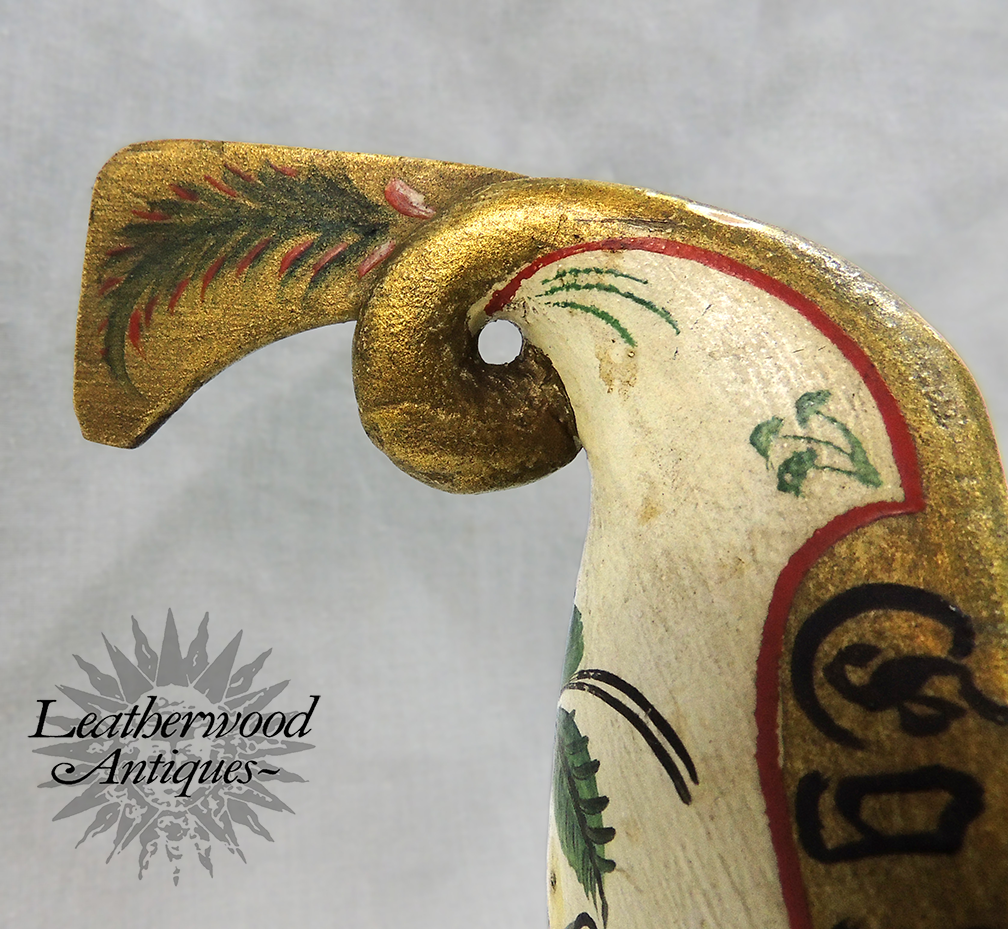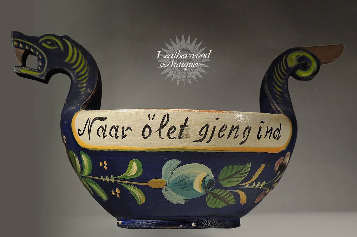 Carved & painted Norwegian dragon drinking vessel. The writing translates to “I carry [it] around the table” which is a traditional saying often painted on bowls that were passed from guest to guest during celebrations. c. 1920.