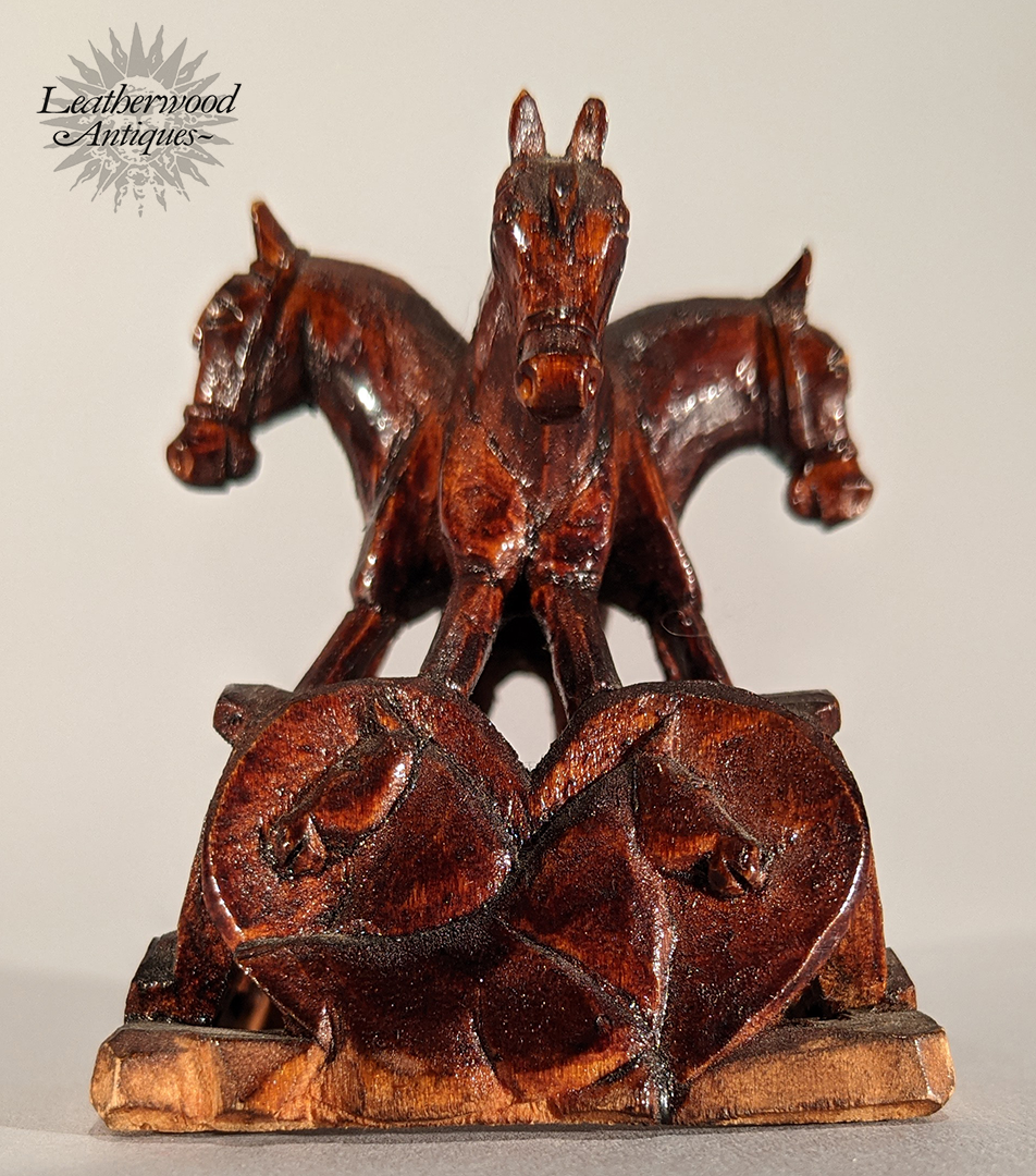 Four horse heads turn outward in a tight, carousel‑like circle, rising from a base carved with five lucky horseshoes and a front heart framed by twin horses. A compact folk carving with symmetry, spirit, and a touch of barn‑loft romance — lively, luck‑laden, and full of quiet character. American, 19th Century.